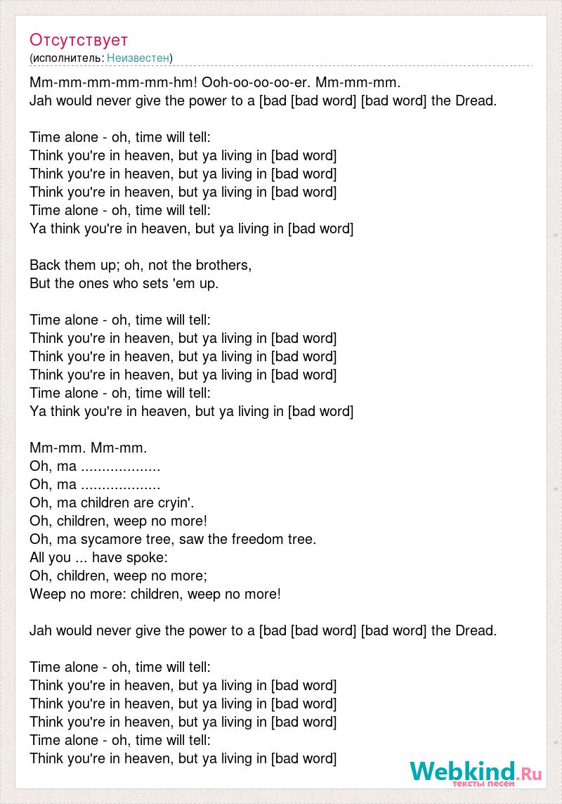 Mm-mm-mm-mm-mm-hm! Ooh-oo-oo-oo-er. Mm-mm-mm. Jah would never give the power to a [bad [bad word] [bad word] the Dread. Time alone - oh, time will tell: Think you're in heaven, but ya living in [bad word] Think you're in heaven, but ya living in [bad word] Think you're in heaven, but ya living in [bad word] Time alone - oh, time will tell: Ya think you're in heaven, but ya living in [bad word] Back them up; oh, not the brothers, But the ones who sets 'em up. Time alone - oh, time will tell: Think you're in heaven, but ya living in [bad word] Think you're in heaven, but ya living in [bad word] Think you're in heaven, but ya living in [bad word] Time alone - oh, time will tell: Ya think you're in heaven, but ya living in [bad word] Mm-mm. Mm-mm. Oh, ma ................... Oh, ma ................... Oh, ma children are cryin'. Oh, children, weep no more! Oh, ma sycamore tree, saw the freedom tree. All you ... have spoke: Oh, children, weep no more; Weep no more: children, weep no more! Jah would never give the power to a [bad [bad word] [bad word] the Dread. Time alone - oh, time will tell: Think you're in heaven, but ya living in [bad word] Think you're in heaven, but ya living in [bad word] Think you're in heaven, but ya living in [bad word] Time alone - oh, time will tell: Think you're in heaven, but ya living in [bad word]
