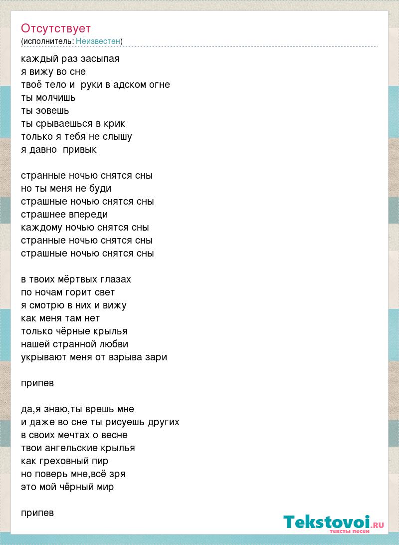 каждый раз засыпая я вижу во сне твоё тело и руки в адском огне ты молчишь ты зовешь ты срываешься в крик только я тебя не слышу я давно привык странные ночью снятся сны но ты меня не буди страшные ночью снятся сны страшнее впереди каждому ночью снятся сны странные ночью снятся сны страшные ночью снятся сны в твоих мёртвых глазах по ночам горит свет я смотрю в них и вижу как меня там нет только чёрные крылья нашей странной любви укрывают меня от взрыва зари припев да,я знаю,ты врешь мне и даже во сне ты рисуешь других в своих мечтах о весне твои ангельские крылья как греховный пир но поверь мне,всё зря это мой чёрный мир припев