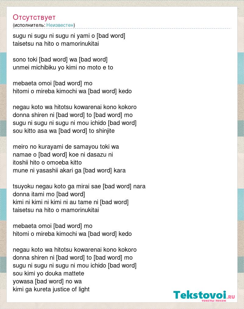 sugu ni sugu ni sugu ni yami o [bad word] taisetsu na hito o mamorinukitai sono toki [bad word] wa [bad word] unmei michibiku yo kimi no moto e to mebaeta omoi [bad word] mo hitomi o mireba kimochi wa [bad word] kedo negau koto wa hitotsu kowarenai kono kokoro donna shiren ni [bad word] to [bad word] mo sugu ni sugu ni sugu ni mou ichido [bad word] sou kitto asa wa [bad word] to shinjite meiro no kurayami de samayou toki wa namae o [bad word] koe ni dasazu ni itoshii hito o omoeba kitto mune ni yasashii akari ga [bad word] kara tsuyoku negau koto ga mirai sae [bad word] nara donna itami mo [bad word] kimi ni kimi ni kimi ni au tame ni [bad word] taisetsu na hito o mamorinukitai mebaeta omoi [bad word] mo hitomi o mireba kimochi wa [bad word] kedo negau koto wa hitotsu kowarenai kono kokoro donna shiren ni [bad word] to [bad word] mo sugu ni sugu ni sugu ni mou ichido [bad word] sou kimi yo douka mattete yowasa [bad word] no wa kimi ga kureta justice of light