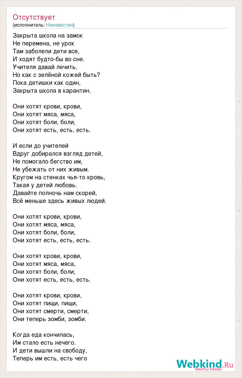 Закрыта школа на замок Не перемена, не урок Там заболели дети все, И ходят будто-бы во сне. Учителя давай лечить, Но как с зелёной кожей быть? Пока детишки как один, Закрыта школа в карантин. Они хотят крови, крови, Они хотят мяса, мяса, Они хотят боли, боли, Они хотят есть, есть, есть. И если до учителей Вдруг добирался взгляд детей, Не помогало бегство им, Не убежать от них живым. Кругом на стенках чья-то кровь, Такая у детей любовь. Давайте полночь нам скорей, Всё меньше здесь живых людей. Они хотят крови, крови, Они хотят мяса, мяса, Они хотят боли, боли, Они хотят есть, есть, есть. Они хотят крови, крови, Они хотят мяса, мяса, Они хотят боли, боли, Они хотят есть, есть, есть. Они хотят крови, крови, Они хотят пищи, пищи, Они хотят смерти, смерти, Они теперь зомби, зомби. Когда еда кончилась, Им стало есть нечего. И дети вышли на свободу, Теперь им есть, есть чего