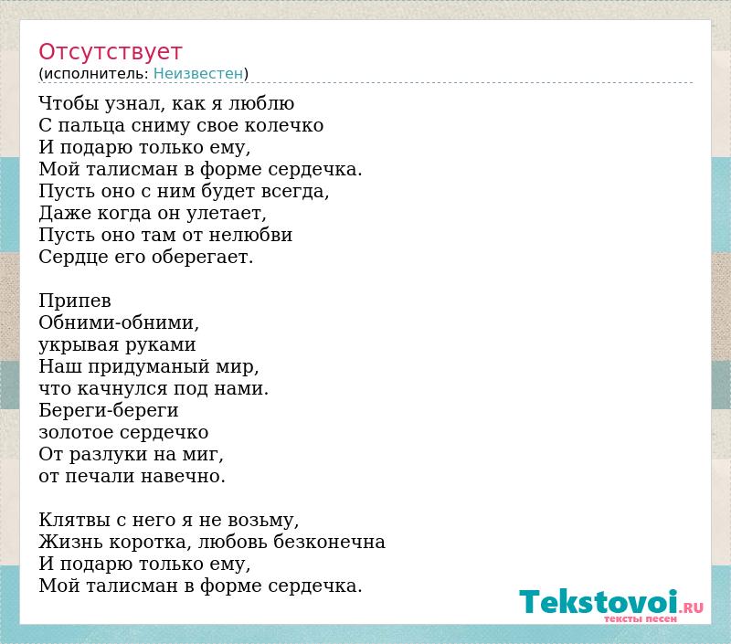 Чтобы узнал, как я люблю С пальца сниму свое колечко И подарю только ему, Мой талисман в форме сердечка. Пусть оно с ним будет всегда, Даже когда он улетает, Пусть оно там от нелюбви Сердце его оберегает. Припев Обними-обними, укрывая руками Наш придуманый мир, что качнулся под нами. Береги-береги золотое сердечко От разлуки на миг, от печали навечно. Клятвы с него я не возьму, Жизнь коротка, любовь безконечна И подарю только ему, Мой талисман в форме сердечка.