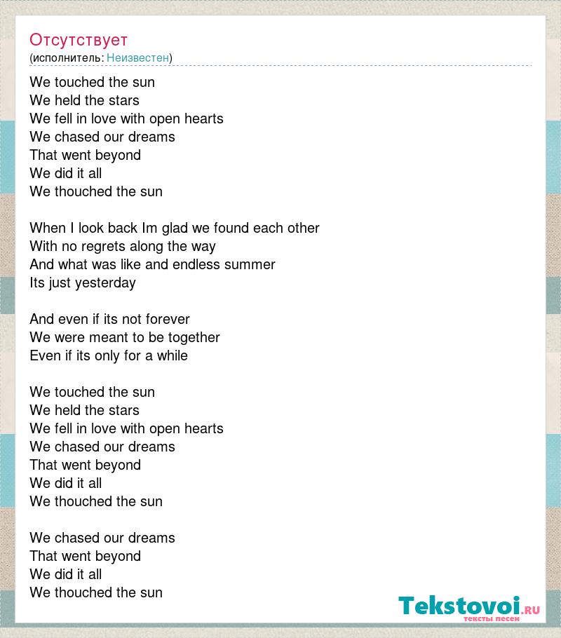 We touched the sun We held the stars We fell in love with open hearts We chased our dreams That went beyond We did it all We thouched the sun When I look back Im glad we found each other With no regrets along the way And what was like and endless summer Its just yesterday And even if its not forever We were meant to be together Even if its only for a while We touched the sun We held the stars We fell in love with open hearts We chased our dreams That went beyond We did it all We thouched the sun We chased our dreams That went beyond We did it all We thouched the sun