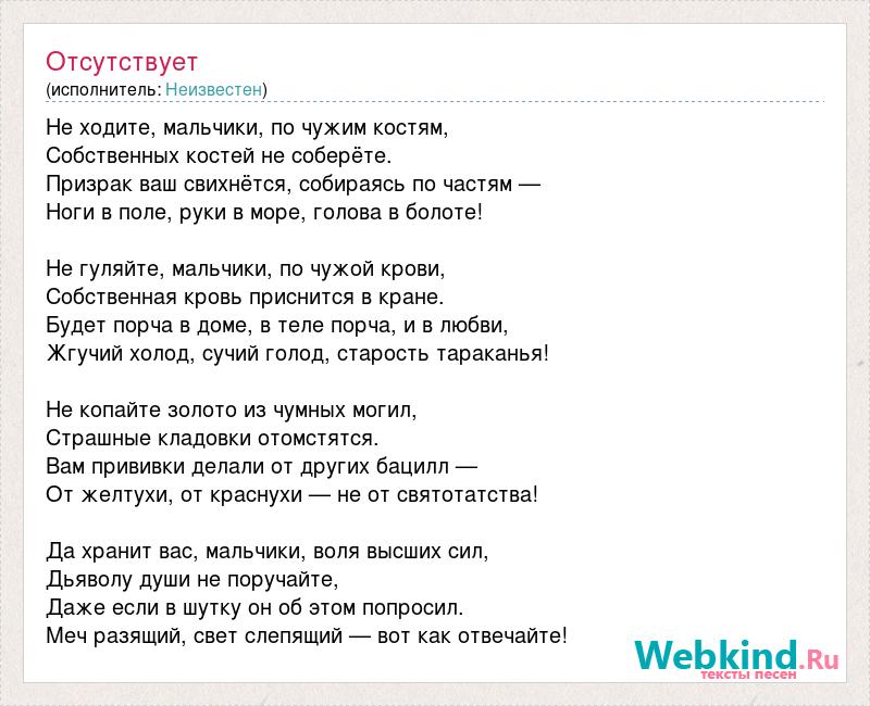 Не ходите, мальчики, по чужим костям, Собственных костей не соберёте. Призрак ваш свихнётся, собираясь по частям — Ноги в поле, руки в море, голова в болоте! Не гуляйте, мальчики, по чужой крови, Собственная кровь приснится в кране. Будет порча в доме, в теле порча, и в любви, Жгучий холод, сучий голод, старость тараканья! Не копайте золото из чумных могил, Страшные кладовки отомстятся. Вам прививки делали от других бацилл — От желтухи, от краснухи — не от святотатства! Да хранит вас, мальчики, воля высших сил, Дьяволу души не поручайте, Даже если в шутку он об этом попросил. Меч разящий, свет слепящий — вот как отвечайте!