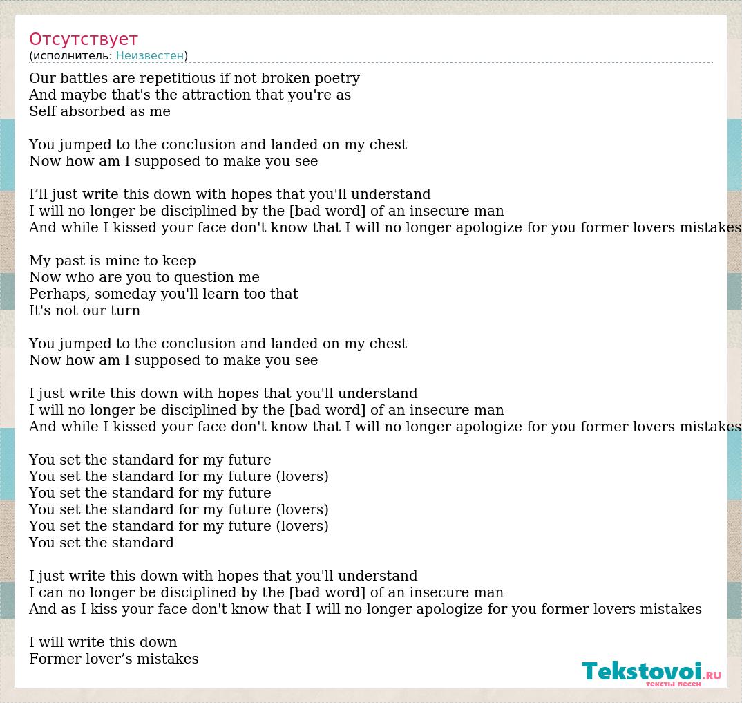 Our battles are repetitious if not broken poetry And maybe that's the attraction that you're as Self absorbed as me You jumped to the conclusion and landed on my chest Now how am I supposed to make you see I’ll just write this down with hopes that you'll understand I will no longer be disciplined by the [bad word] of an insecure man And while I kissed your face don't know that I will no longer apologize for you former lovers mistakes My past is mine to keep Now who are you to question me Perhaps, someday you'll learn too that It's not our turn You jumped to the conclusion and landed on my chest Now how am I supposed to make you see I just write this down with hopes that you'll understand I will no longer be disciplined by the [bad word] of an insecure man And while I kissed your face don't know that I will no longer apologize for you former lovers mistakes You set the standard for my future You set the standard for my future (lovers) You set the standard for my future You set the standard for my future (lovers) You set the standard for my future (lovers) You set the standard I just write this down with hopes that you'll understand I can no longer be disciplined by the [bad word] of an insecure man And as I kiss your face don't know that I will no longer apologize for you former lovers mistakes I will write this down Former lover’s mistakes