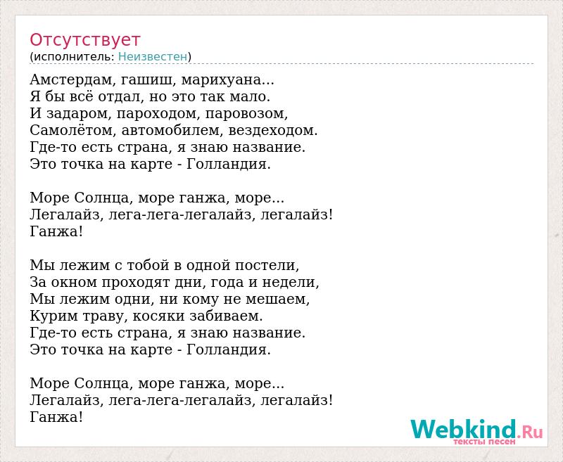 Амстердам, гашиш, марихуана... Я бы всё отдал, но это так мало. И задаром, пароходом, паровозом, Самолётом, автомобилем, вездеходом. Где-то есть страна, я знаю название. Это точка на карте - Голландия. Море Солнца, море ганжа, море... Легалайз, лега-лега-легалайз, легалайз! Ганжа! Мы лежим с тобой в одной постели, За окном проходят дни, года и недели, Мы лежим одни, ни кому не мешаем, Курим траву, косяки забиваем. Где-то есть страна, я знаю название. Это точка на карте - Голландия. Море Солнца, море ганжа, море... Легалайз, лега-лега-легалайз, легалайз! Ганжа!