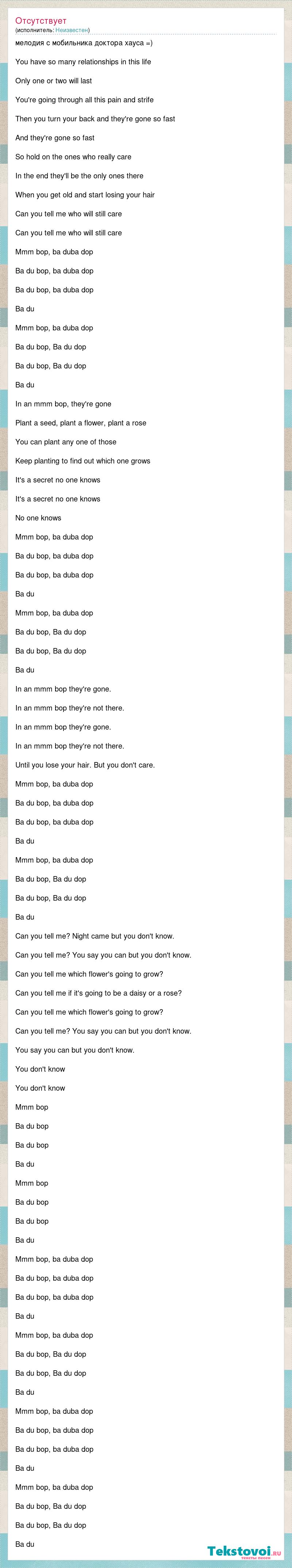 мелодия с мобильника доктора хауса =) You have so many relationships in this life Only one or two will last You're going through all this pain and strife Then you turn your back and they're gone so fast And they're gone so fast So hold on the ones who really care In the end they'll be the only ones there When you get old and start losing your hair Can you tell me who will still care Can you tell me who will still care Mmm bop, ba duba dop Ba du bop, ba duba dop Ba du bop, ba duba dop Ba du Mmm bop, ba duba dop Ba du bop, Ba du dop Ba du bop, Ba du dop Ba du In an mmm bop, they're gone Plant a seed, plant a flower, plant a rose You can plant any one of those Keep planting to find out which one grows It's a secret no one knows It's a secret no one knows No one knows Mmm bop, ba duba dop Ba du bop, ba duba dop Ba du bop, ba duba dop Ba du Mmm bop, ba duba dop Ba du bop, Ba du dop Ba du bop, Ba du dop Ba du In an mmm bop they're gone. In an mmm bop they're not there. In an mmm bop they're gone. In an mmm bop they're not there. Until you lose your hair. But you don't care. Mmm bop, ba duba dop Ba du bop, ba duba dop Ba du bop, ba duba dop Ba du Mmm bop, ba duba dop Ba du bop, Ba du dop Ba du bop, Ba du dop Ba du Can you tell me? Night came but you don't know. Can you tell me? You say you can but you don't know. Can you tell me which flower's going to grow? Can you tell me if it's going to be a daisy or a rose? Can you tell me which flower's going to grow? Can you tell me? You say you can but you don't know. You say you can but you don't know. You don't know You don't know Mmm bop Ba du bop Ba du bop Ba du Mmm bop Ba du bop Ba du bop Ba du Mmm bop, ba duba dop Ba du bop, ba duba dop Ba du bop, ba duba dop Ba du Mmm bop, ba duba dop Ba du bop, Ba du dop Ba du bop, Ba du dop Ba du Mmm bop, ba duba dop Ba du bop, ba duba dop Ba du bop, ba duba dop Ba du Mmm bop, ba duba dop Ba du bop, Ba du dop Ba du bop, Ba du dop Ba du