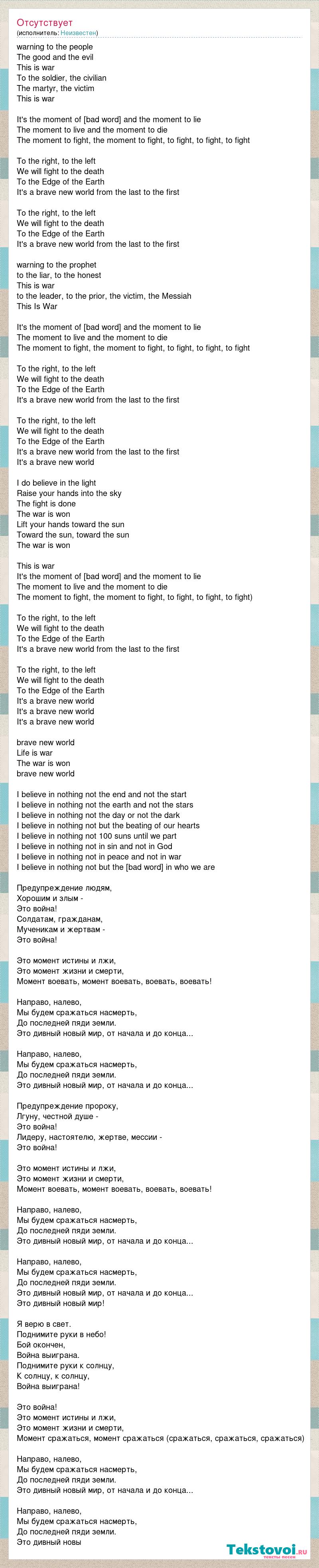 warning to the people The good and the evil This is war To the soldier, the civilian The martyr, the victim This is war It's the moment of [bad word] and the moment to lie The moment to live and the moment to die The moment to fight, the moment to fight, to fight, to fight, to fight To the right, to the left We will fight to the death To the Edge of the Earth It's a brave new world from the last to the first To the right, to the left We will fight to the death To the Edge of the Earth It's a brave new world from the last to the first warning to the prophet to the liar, to the honest This is war to the leader, to the prior, the victim, the Messiah This Is War It's the moment of [bad word] and the moment to lie The moment to live and the moment to die The moment to fight, the moment to fight, to fight, to fight, to fight To the right, to the left We will fight to the death To the Edge of the Earth It's a brave new world from the last to the first To the right, to the left We will fight to the death To the Edge of the Earth It's a brave new world from the last to the first It's a brave new world I do believe in the light Raise your hands into the sky The fight is done The war is won Lift your hands toward the sun Toward the sun, toward the sun The war is won This is war It's the moment of [bad word] and the moment to lie The moment to live and the moment to die The moment to fight, the moment to fight, to fight, to fight, to fight) To the right, to the left We will fight to the death To the Edge of the Earth It's a brave new world from the last to the first To the right, to the left We will fight to the death To the Edge of the Earth It's a brave new world It's a brave new world It's a brave new world brave new world Life is war The war is won brave new world I believe in nothing not the end and not the start I believe in nothing not the earth and not the stars I believe in nothing not the day or not the dark I believe in nothing not but the beating of our hearts I believe in nothing not 100 suns until we part I believe in nothing not in sin and not in God I believe in nothing not in peace and not in war I believe in nothing not but the [bad word] in who we are Предупреждение людям, Хорошим и злым - Это война! Солдатам, гражданам, Мученикам и жертвам - Это война! Это момент истины и лжи, Это момент жизни и смерти, Момент воевать, момент воевать, воевать, воевать! Направо, налево, Мы будем сражаться насмерть, До последней пяди земли. Это дивный новый мир, от начала и до конца... Направо, налево, Мы будем сражаться насмерть, До последней пяди земли. Это дивный новый мир, от начала и до конца... Предупреждение пророку, Лгуну, честной душе - Это война! Лидеру, настоятелю, жертве, мессии - Это война! Это момент истины и лжи, Это момент жизни и смерти, Момент воевать, момент воевать, воевать, воевать! Направо, налево, Мы будем сражаться насмерть, До последней пяди земли. Это дивный новый мир, от начала и до конца... Направо, налево, Мы будем сражаться насмерть, До последней пяди земли. Это дивный новый мир, от начала и до конца... Это дивный новый мир! Я верю в свет. Поднимите руки в небо! Бой окончен, Война выиграна. Поднимите руки к солнцу, К солнцу, к солнцу, Война выиграна! Это война! Это момент истины и лжи, Это момент жизни и смерти, Момент сражаться, момент сражаться (сражаться, сражаться, сражаться) Направо, налево, Мы будем сражаться насмерть, До последней пяди земли. Это дивный новый мир, от начала и до конца... Направо, налево, Мы будем сражаться насмерть, До последней пяди земли. Это дивный новы