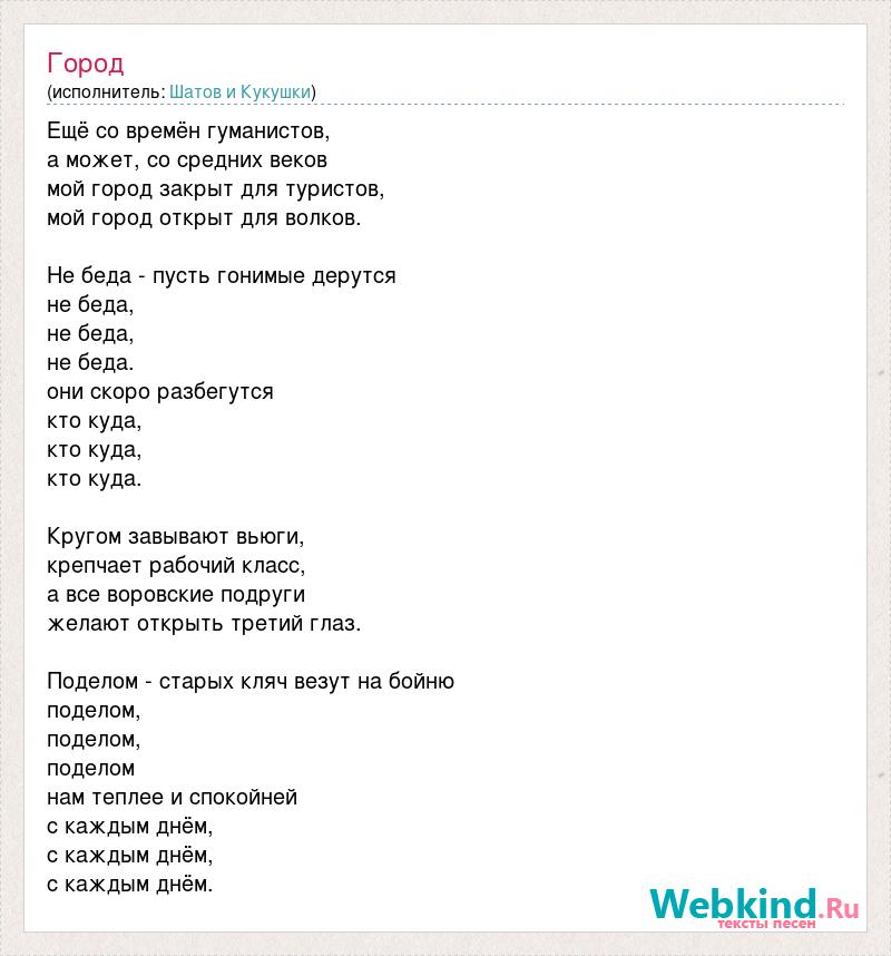 Ещё со времён гуманистов, а может, со средних веков мой город закрыт для туристов, мой город открыт для волков. Не беда - пусть гонимые дерутся не беда, не беда, не беда. они скоро разбегутся кто куда, кто куда, кто куда. Кругом завывают вьюги, крепчает рабочий класс, а все воровские подруги желают открыть третий глаз. Поделом - старых кляч везут на бойню поделом, поделом, поделом нам теплее и спокойней с каждым днём, с каждым днём, с каждым днём.