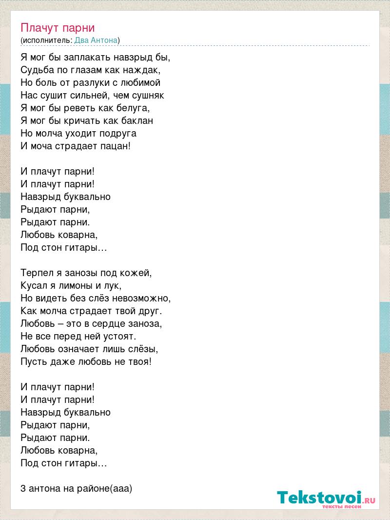 Я мог бы заплакать навзрыд бы, Судьба по глазам как наждак, Но боль от разлуки с любимой Нас сушит сильней, чем сушняк Я мог бы реветь как белуга, Я мог бы кричать как баклан Но молча уходит подруга И моча страдает пацан! И плачут парни! И плачут парни! Навзрыд буквально Рыдают парни, Рыдают парни. Любовь коварна, Под стон гитары… Терпел я занозы под кожей, Кусал я лимоны и лук, Но видеть без слёз невозможно, Как молча страдает твой друг. Любовь – это в сердце заноза, Не все перед ней устоят. Любовь означает лишь слёзы, Пусть даже любовь не твоя! И плачут парни! И плачут парни! Навзрыд буквально Рыдают парни, Рыдают парни. Любовь коварна, Под стон гитары… 3 антона на районе(ааа)
