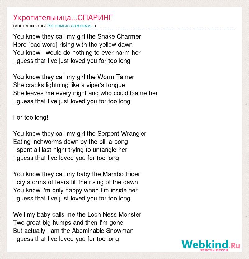You know they call my girl the Snake Charmer Here [bad word] rising with the yellow dawn You know I would do nothing to ever harm her I guess that I've just loved you for too long You know they call my girl the Worm Tamer She cracks lightning like a viper's tongue She leaves me every night and who could blame her I guess that I've just loved you for too long For too long! You know they call my girl the Serpent Wrangler Eating inchworms down by the bill-a-bong I spent all last night trying to untangle her I guess that I've loved you for too long You know they call my baby the Mambo Rider I cry storms of tears till the rising of the dawn You know I'm only happy when I'm inside her I guess that I've just loved you for too long Well my baby calls me the Loch Ness Monster Two great big humps and then I'm gone But actually I am the Abominable Snowman I guess that I've loved you for too long