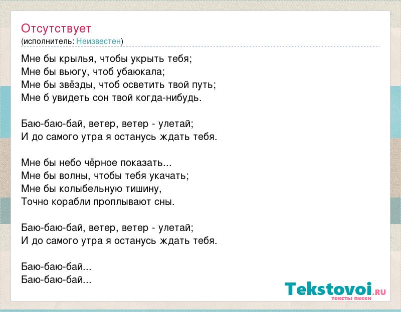 Мне бы крылья, чтобы укрыть тебя; Мне бы вьюгу, чтоб убаюкала; Мне бы звёзды, чтоб осветить твой путь; Мне б увидеть сон твой когда-нибудь. Баю-баю-бай, ветер, ветер - улетай; И до самого утра я останусь ждать тебя. Мне бы небо чёрное показать... Мне бы волны, чтобы тебя укачать; Мне бы колыбельную тишину, Точно корабли проплывают сны. Баю-баю-бай, ветер, ветер - улетай; И до самого утра я останусь ждать тебя. Баю-баю-бай... Баю-баю-бай...