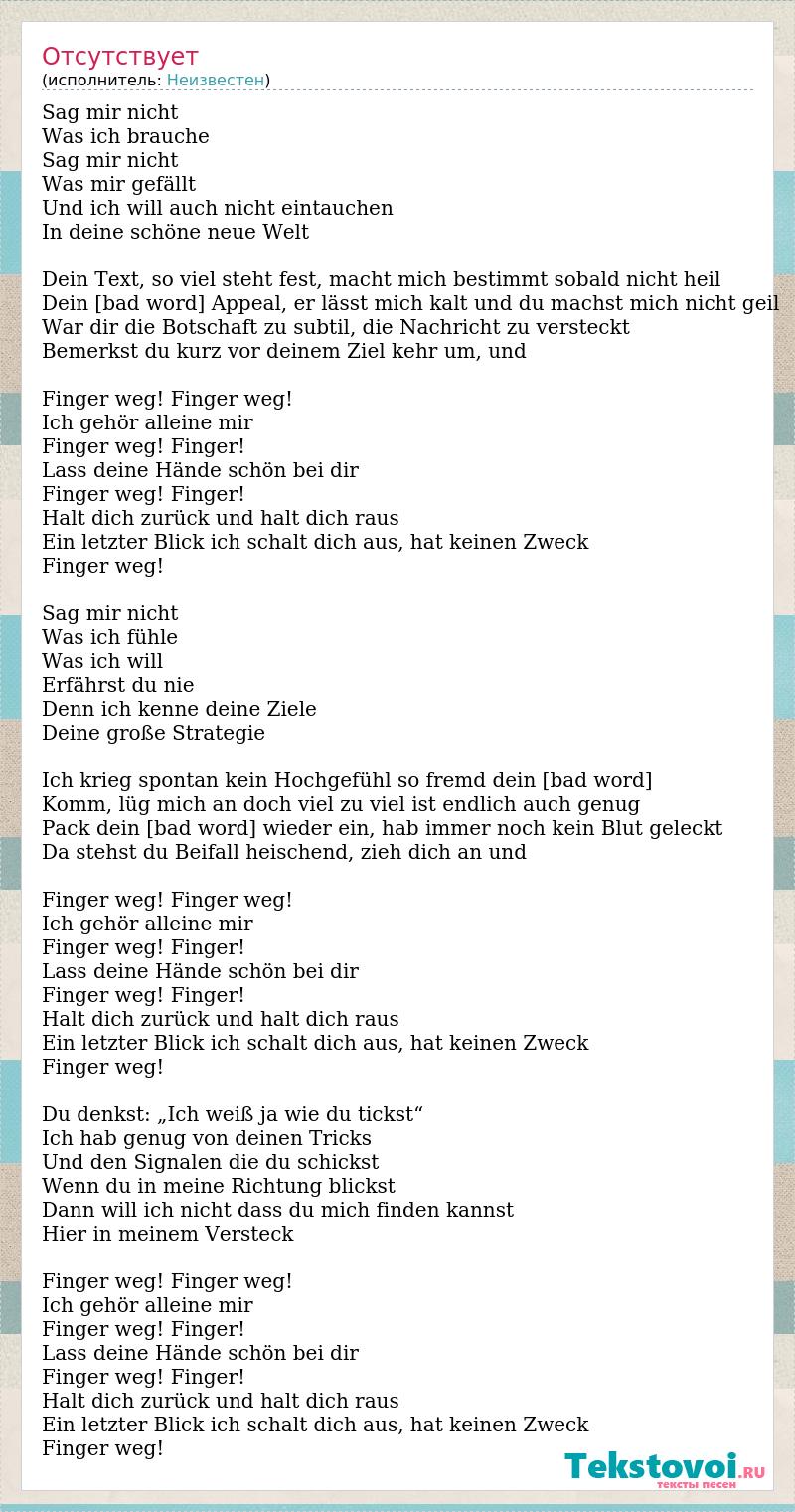 Sag mir nicht Was ich brauche Sag mir nicht Was mir gefällt Und ich will auch nicht eintauchen In deine schöne neue Welt Dein Text, so viel steht fest, macht mich bestimmt sobald nicht heil Dein [bad word] Appeal, er lässt mich kalt und du machst mich nicht geil War dir die Botschaft zu subtil, die Nachricht zu versteckt Bemerkst du kurz vor deinem Ziel kehr um, und Finger weg! Finger weg! Ich gehör alleine mir Finger weg! Finger! Lass deine Hände schön bei dir Finger weg! Finger! Halt dich zurück und halt dich raus Ein letzter Blick ich schalt dich aus, hat keinen Zweck Finger weg! Sag mir nicht Was ich fühle Was ich will Erfährst du nie Denn ich kenne deine Ziele Deine große Strategie Ich krieg spontan kein Hochgefühl so fremd dein [bad word] Komm, lüg mich an doch viel zu viel ist endlich auch genug Pack dein [bad word] wieder ein, hab immer noch kein Blut geleckt Da stehst du Beifall heischend, zieh dich an und Finger weg! Finger weg! Ich gehör alleine mir Finger weg! Finger! Lass deine Hände schön bei dir Finger weg! Finger! Halt dich zurück und halt dich raus Ein letzter Blick ich schalt dich aus, hat keinen Zweck Finger weg! Du denkst: „Ich weiß ja wie du tickst“ Ich hab genug von deinen Tricks Und den Signalen die du schickst Wenn du in meine Richtung blickst Dann will ich nicht dass du mich finden kannst Hier in meinem Versteck Finger weg! Finger weg! Ich gehör alleine mir Finger weg! Finger! Lass deine Hände schön bei dir Finger weg! Finger! Halt dich zurück und halt dich raus Ein letzter Blick ich schalt dich aus, hat keinen Zweck Finger weg!