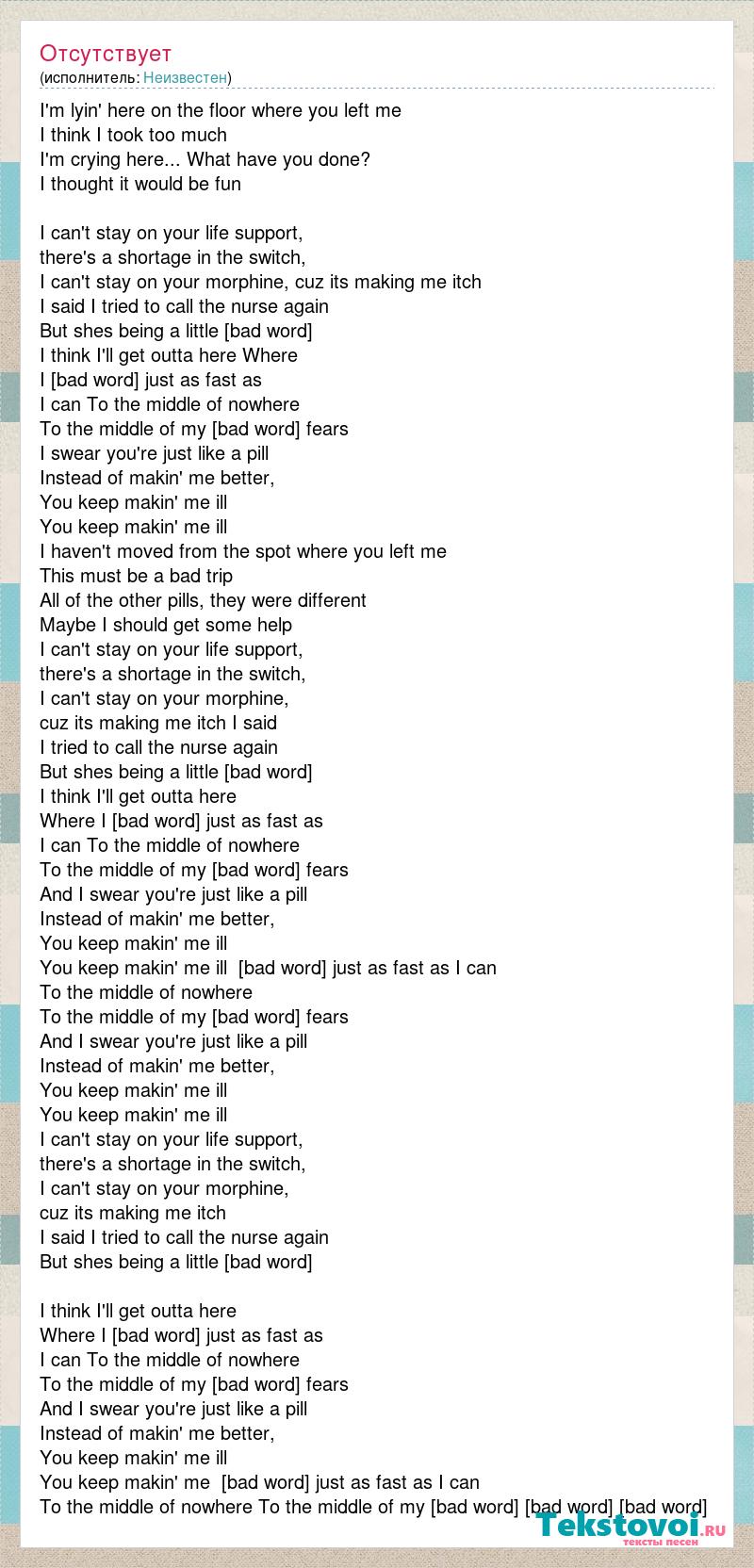 I'm lyin' here on the floor where you left me I think I took too much I'm crying here... What have you done? I thought it would be fun I can't stay on your life support, there's a shortage in the switch, I can't stay on your morphine, cuz its making me itch I said I tried to call the nurse again But shes being a little [bad word] I think I'll get outta here Where I [bad word] just as fast as I can To the middle of nowhere To the middle of my [bad word] fears I swear you're just like a pill Instead of makin' me better, You keep makin' me ill You keep makin' me ill I haven't moved from the spot where you left me This must be a bad trip All of the other pills, they were different Maybe I should get some help I can't stay on your life support, there's a shortage in the switch, I can't stay on your morphine, cuz its making me itch I said I tried to call the nurse again But shes being a little [bad word] I think I'll get outta here Where I [bad word] just as fast as I can To the middle of nowhere To the middle of my [bad word] fears And I swear you're just like a pill Instead of makin' me better, You keep makin' me ill You keep makin' me ill [bad word] just as fast as I can To the middle of nowhere To the middle of my [bad word] fears And I swear you're just like a pill Instead of makin' me better, You keep makin' me ill You keep makin' me ill I can't stay on your life support, there's a shortage in the switch, I can't stay on your morphine, cuz its making me itch I said I tried to call the nurse again But shes being a little [bad word] I think I'll get outta here Where I [bad word] just as fast as I can To the middle of nowhere To the middle of my [bad word] fears And I swear you're just like a pill Instead of makin' me better, You keep makin' me ill You keep makin' me [bad word] just as fast as I can To the middle of nowhere To the middle of my [bad word] [bad word] [bad word]