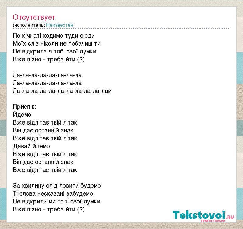 По кімнаті ходимо туди-сюди Моїх сліз ніколи не побачиш ти Не відкрила я тобі свої думки Вже пізно - треба йти (2) Ла-ла-ла-ла-ла-ла-ла-ла Ла-ла-ла-ла-ла-ла-ла-ла Ла-ла-ла-ла-ла-ла-ла-ла-ла-ла-лай Приспів: Йдемо Вже відлітає твій літак Він дає останній знак Вже відлітає твій літак Давай йдемо Вже відлітає твій літак Він дає останній знак Вже відлітає твій літак За хвилину слід ловити будемо Ті слова несказані забудемо Не відкрили ми тоді свої думки Вже пізно - треба йти (2)