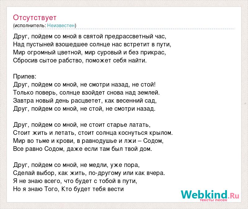 Друг, пойдем со мной в святой предрассветный час, Над пустыней взошедшее солнце нас встретит в пути, Мир огромный цветной, мир суровый и без прикрас, Сбросив сытое рабство, поможет себя найти. Припев: Друг, пойдем со мной, не смотри назад, не стой! Только поверь, солнце взойдет снова над землей. Завтра новый день расцветет, как весенний сад, Друг, пойдем со мной, не стой, не смотри назад. Друг, пойдем со мной, не стоит старье латать, Стоит жить и летать, стоит солнца коснуться крылом. Мир во тьме и крови, в равнодушье и лжи – Содом, Все равно Содом, даже если там был твой дом. Друг, пойдем со мной, не медли, уже пора, Сделай выбор, как жить, по-другому или как вчера. Я не знаю всего, что будет с тобой в пути, Но я знаю Того, Кто будет тебя вести