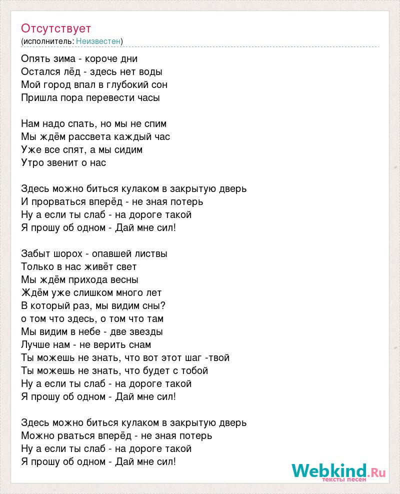 Опять зима - короче дни Остался лёд - здесь нет воды Мой город впал в глубокий сон Пришла пора перевести часы Нам надо спать, но мы не спим Мы ждём рассвета каждый час Уже все спят, а мы сидим Утро звенит о нас Здесь можно биться кулаком в закрытую дверь И прорваться вперёд - не зная потерь Ну а если ты слаб - на дороге такой Я прошу об одном - Дай мне сил! Забыт шорох - опавшей листвы Только в нас живёт свет Мы ждём прихода весны Ждём уже слишком много лет В который раз, мы видим сны? о том что здесь, о том что там Мы видим в небе - две звезды Лучше нам - не верить снам Ты можешь не знать, что вот этот шаг -твой Ты можешь не знать, что будет с тобой Ну а если ты слаб - на дороге такой Я прошу об одном - Дай мне сил! Здесь можно биться кулаком в закрытую дверь Можно рваться вперёд - не зная потерь Ну а если ты слаб - на дороге такой Я прошу об одном - Дай мне сил!