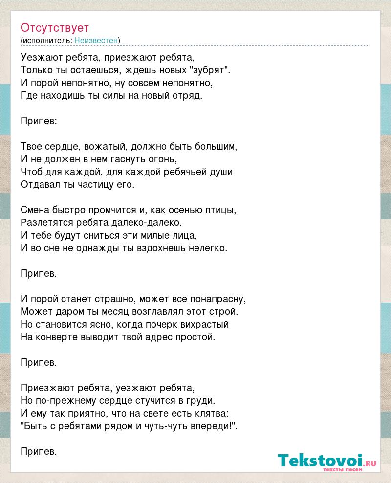 Уезжают ребята, приезжают ребята, Только ты остаешься, ждешь новых "зубрят". И порой непонятно, ну совсем непонятно, Где находишь ты силы на новый отряд. Припев: Твое сердце, вожатый, должно быть большим, И не должен в нем гаснуть огонь, Чтоб для каждой, для каждой ребячьей души Отдавал ты частицу его. Смена быстро промчится и, как осенью птицы, Разлетятся ребята далеко-далеко. И тебе будут сниться эти милые лица, И во сне не однажды ты вздохнешь нелегко. Припев. И порой станет страшно, может все понапрасну, Может даром ты месяц возглавлял этот строй. Но становится ясно, когда почерк вихрастый На конверте выводит твой адрес простой. Припев. Приезжают ребята, уезжают ребята, Но по-прежнему сердце стучится в груди. И ему так приятно, что на свете есть клятва: "Быть с ребятами рядом и чуть-чуть впереди!". Припев.