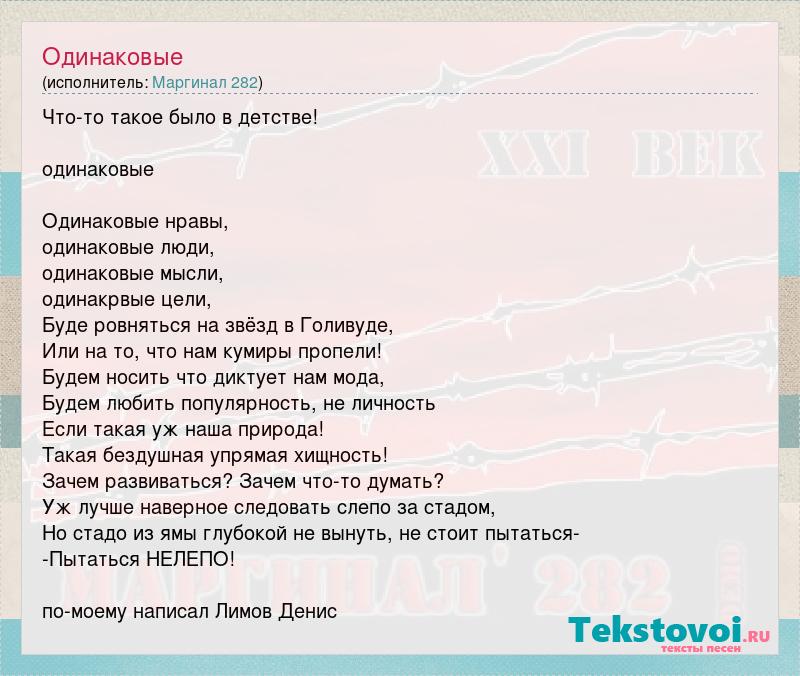 Что-то такое было в детстве! одинаковые Одинаковые нравы, одинаковые люди, одинаковые мысли, одинакрвые цели, Буде ровняться на звёзд в Голивуде, Или на то, что нам кумиры пропели! Будем носить что диктует нам мода, Будем любить популярность, не личность Если такая уж наша природа! Такая бездушная упрямая хищность! Зачем развиваться? Зачем что-то думать? Уж лучше наверное следовать слепо за стадом, Но стадо из ямы глубокой не вынуть, не стоит пытаться- -Пытаться НЕЛЕПО! по-моему написал Лимов Денис