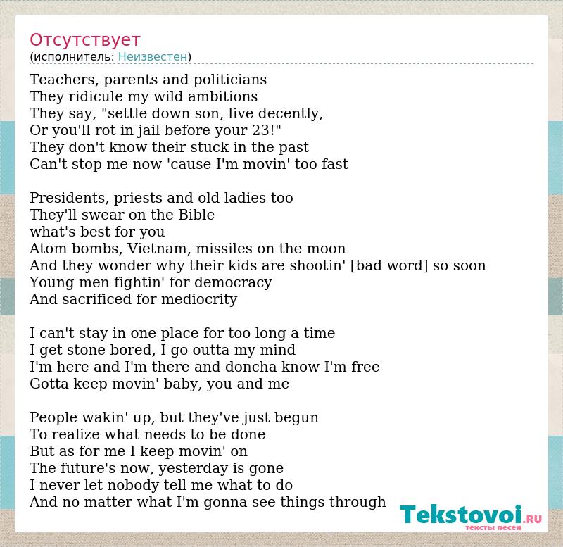 Teachers, parents and politicians They ridicule my wild ambitions They say, "settle down son, live decently, Or you'll rot in jail before your 23!" They don't know their stuck in the past Can't stop me now 'cause I'm movin' too fast Presidents, priests and old ladies too They'll swear on the Bible what's best for you Atom bombs, Vietnam, missiles on the moon And they wonder why their kids are shootin' [bad word] so soon Young men fightin' for democracy And sacrificed for mediocrity I can't stay in one place for too long a time I get stone bored, I go outta my mind I'm here and I'm there and doncha know I'm free Gotta keep movin' baby, you and me People wakin' up, but they've just begun To realize what needs to be done But as for me I keep movin' on The future's now, yesterday is gone I never let nobody tell me what to do And no matter what I'm gonna see things through
