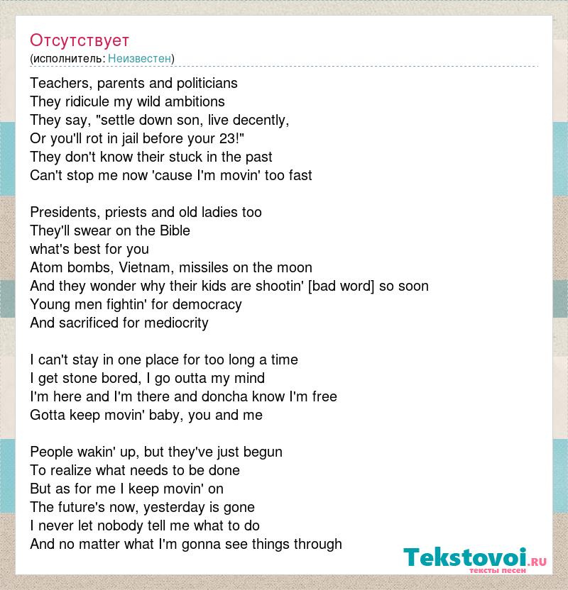 Teachers, parents and politicians They ridicule my wild ambitions They say, "settle down son, live decently, Or you'll rot in jail before your 23!" They don't know their stuck in the past Can't stop me now 'cause I'm movin' too fast Presidents, priests and old ladies too They'll swear on the Bible what's best for you Atom bombs, Vietnam, missiles on the moon And they wonder why their kids are shootin' [bad word] so soon Young men fightin' for democracy And sacrificed for mediocrity I can't stay in one place for too long a time I get stone bored, I go outta my mind I'm here and I'm there and doncha know I'm free Gotta keep movin' baby, you and me People wakin' up, but they've just begun To realize what needs to be done But as for me I keep movin' on The future's now, yesterday is gone I never let nobody tell me what to do And no matter what I'm gonna see things through