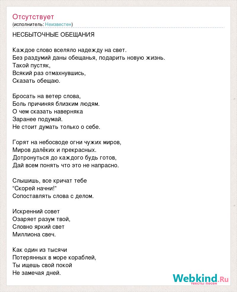 НЕСБЫТОЧНЫЕ ОБЕЩАНИЯ Каждое слово вселяло надежду на свет. Без раздумий даны обещанья, подарить новую жизнь. Такой пустяк, Всякий раз отмахнувшись, Сказать обещаю. Бросать на ветер слова, Боль причиняя близким людям. О чем сказать наверняка Заранее подумай. Не стоит думать только о себе. Горят на небосводе огни чужих миров, Миров далёких и прекрасных. Дотронуться до каждого будь готов, Дай всем понять что это не напрасно. Слышишь, все кричат тебе “Скорей начни!” Сопоставлять слова с делом. Искренний совет Озаряет разум твой, Словно яркий свет Миллиона свеч. Как один из тысячи Потерянных в море кораблей, Ты ищешь свой покой Не замечая дней.