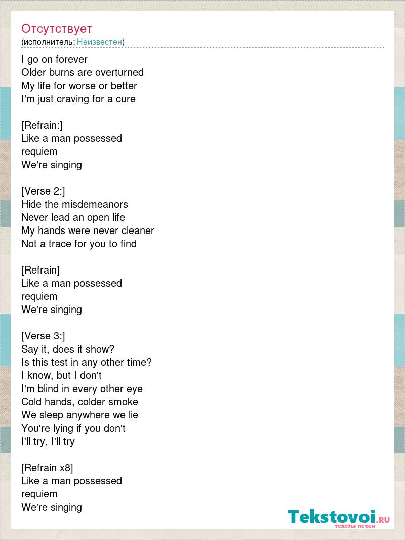 I go on forever Older burns are overturned My life for worse or better I'm just craving for a cure [Refrain:] Like a man possessed requiem We're singing [Verse 2:] Hide the misdemeanors Never lead an open life My hands were never cleaner Not a trace for you to find [Refrain] Like a man possessed requiem We're singing [Verse 3:] Say it, does it show? Is this test in any other time? I know, but I don't I'm blind in every other eye Cold hands, colder smoke We sleep anywhere we lie You're lying if you don't I'll try, I'll try [Refrain x8] Like a man possessed requiem We're singing