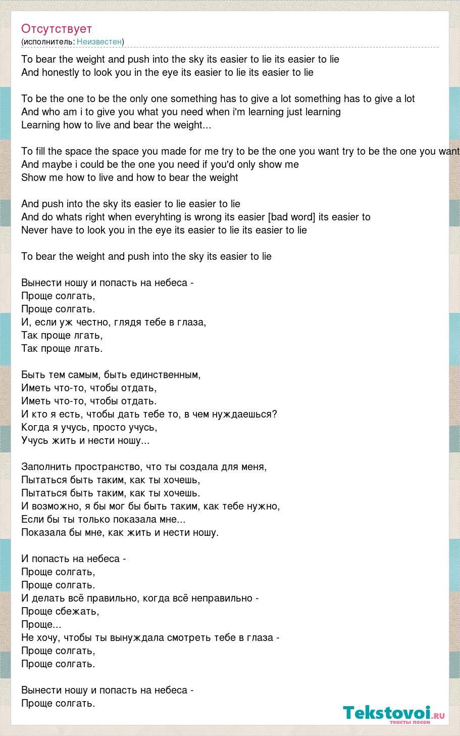 To bear the weight and push into the sky its easier to lie its easier to lie And honestly to look you in the eye its easier to lie its easier to lie To be the one to be the only one something has to give a lot something has to give a lot And who am i to give you what you need when i'm learning just learning Learning how to live and bear the weight... To fill the space the space you made for me try to be the one you want try to be the one you want And maybe i could be the one you need if you'd only show me Show me how to live and how to bear the weight And push into the sky its easier to lie easier to lie And do whats right when everyhting is wrong its easier [bad word] its easier to Never have to look you in the eye its easier to lie its easier to lie To bear the weight and push into the sky its easier to lie Вынести ношу и попасть на небеса - Проще солгать, Проще солгать. И, если уж честно, глядя тебе в глаза, Так проще лгать, Так проще лгать. Быть тем самым, быть единственным, Иметь что-то, чтобы отдать, Иметь что-то, чтобы отдать. И кто я есть, чтобы дать тебе то, в чем нуждаешься? Когда я учусь, просто учусь, Учусь жить и нести ношу... Заполнить пространство, что ты создала для меня, Пытаться быть таким, как ты хочешь, Пытаться быть таким, как ты хочешь. И возможно, я бы мог бы быть таким, как тебе нужно, Если бы ты только показала мне... Показала бы мне, как жить и нести ношу. И попасть на небеса - Проще солгать, Проще солгать. И делать всё правильно, когда всё неправильно - Проще сбежать, Проще... Не хочу, чтобы ты вынуждала смотреть тебе в глаза - Проще солгать, Проще солгать. Вынести ношу и попасть на небеса - Проще солгать.