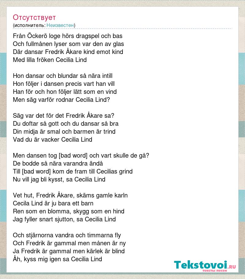 Från Öckerö loge hörs dragspel och bas Och fullmånen lyser som var den av glas Där dansar Fredrik Åkare kind emot kind Med lilla fröken Cecilia Lind Hon dansar och blundar så nära intill Hon följer i dansen precis vart han vill Han för och hon följer lätt som en vind Men säg varför rodnar Cecilia Lind? Säg var det för det Fredrik Åkare sa? Du doftar så gott och du dansar så bra Din midja är smal och barmen är trind Vad du är vacker Cecilia Lind Men dansen tog [bad word] och vart skulle de gå? De bodde så nära varandra ändå Till [bad word] kom de fram till Cecilias grind Nu vill jag bli kysst, sa Cecilia Lind Vet hut, Fredrik Åkare, skäms gamle karln Cecila Lind är ju bara ett barn Ren som en blomma, skygg som en hind Jag fyller snart sjutton, sa Cecilia Lind Och stjärnorna vandra och timmarna fly Och Fredrik är gammal men månen är ny Ja Fredrik är gammal men kärlek är blind Åh, kyss mig igen sa Cecilia Lind