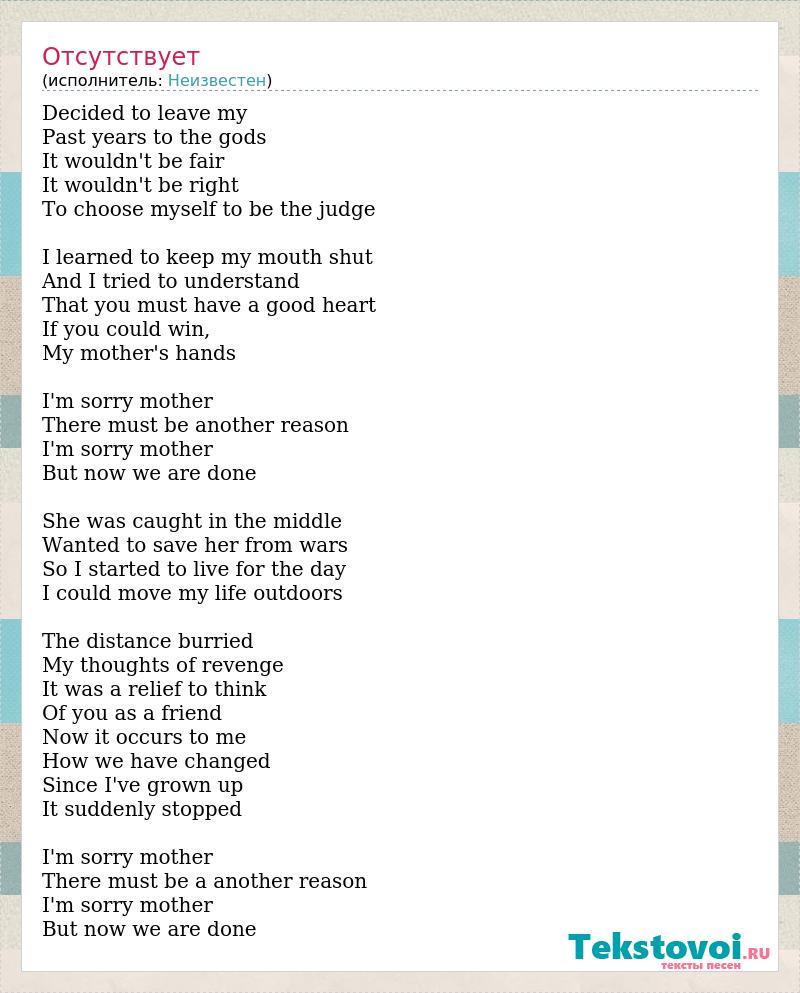 Decided to leave my Past years to the gods It wouldn't be fair It wouldn't be right To choose myself to be the judge I learned to keep my mouth shut And I tried to understand That you must have a good heart If you could win, My mother's hands I'm sorry mother There must be another reason I'm sorry mother But now we are done She was caught in the middle Wanted to save her from wars So I started to live for the day I could move my life outdoors The distance burried My thoughts of revenge It was a relief to think Of you as a friend Now it occurs to me How we have changed Since I've grown up It suddenly stopped I'm sorry mother There must be a another reason I'm sorry mother But now we are done