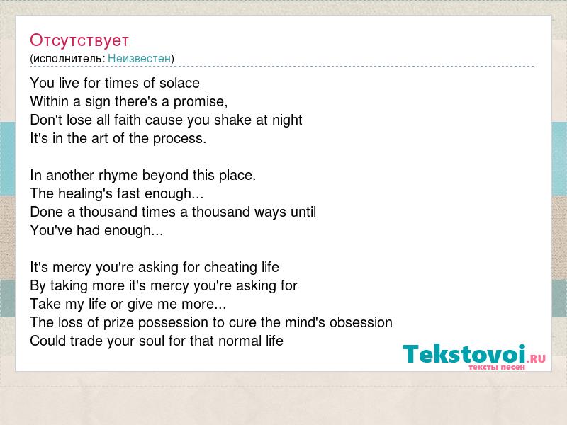 You live for times of solace Within a sign there's a promise, Don't lose all faith cause you shake at night It's in the art of the process. In another rhyme beyond this place. The healing's fast enough... Done a thousand times a thousand ways until You've had enough... It's mercy you're asking for cheating life By taking more it's mercy you're asking for Take my life or give me more... The loss of prize possession to cure the mind's obsession Could trade your soul for that normal life