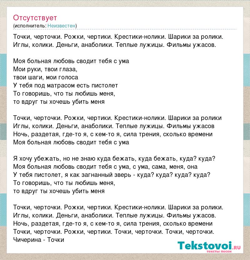 Точки, черточки. Рожки, чертики. Крестики-нолики. Шарики за ролики. Иглы, колики. Деньги, анаболики. Теплые лужицы. Фильмы ужасов. Моя больная любовь сводит тебя с ума Мои руки, твои глаза, твои шаги, мои голоса У тебя под матрасом есть пистолет То говоришь, что ты любишь меня, то вдруг ты хочешь убить меня Точки, черточки. Рожки, чертики. Крестики-нолики. Шарики за ролики Иглы, колики. Деньги, анаболики. Теплые лужицы. Фильмы ужасов Hочь, раздетая, где-то я, с кем-то я, сила трения, сколько времени Моя больная любовь сводит тебя с ума Я хочу убежать, но не знаю куда бежать, куда бежать, куда? куда? Моя больная любовь сводит тебя с ума, с ума, сама, меня, она У тебя пистолет, я как загнанный зверь - куда? куда? куда? куда? То говоришь, что ты любишь меня, то вдруг ты хочешь убить меня Точки, черточки. Рожки, чертики. Крестики-нолики. Шарики за ролики. Иглы, колики. Деньги, анаболики. Теплые лужицы. Фильмы ужасов. Hочь, раздетая, где-то я, с кем-то я, сила трения, сколько времени Точки, черточки. Рожки, чертики. Точки, черточки. Точки, черточки. Чичерина - Точки