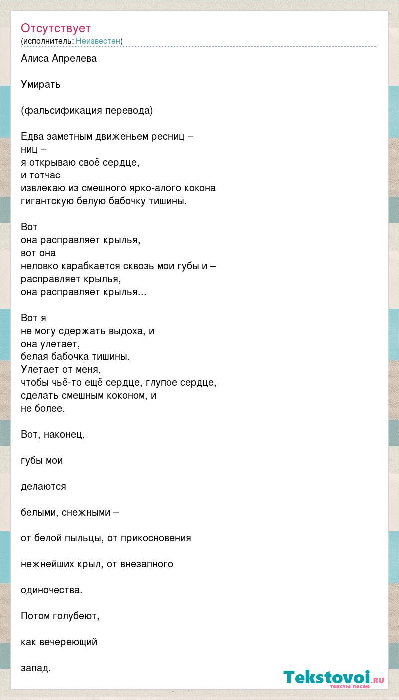 Алиса Апрелева Умирать (фальсификация перевода) Едва заметным движеньем ресниц – ниц – я открываю своё сердце, и тотчас извлекаю из смешного ярко-алого кокона гигантскую белую бабочку тишины. Вот она расправляет крылья, вот она неловко карабкается сквозь мои губы и – расправляет крылья, она расправляет крылья... Вот я не могу сдержать выдоха, и она улетает, белая бабочка тишины. Улетает от меня, чтобы чьё-то ещё сердце, глупое сердце, сделать смешным коконом, и не более. Вот, наконец, губы мои делаются белыми, снежными – от белой пыльцы, от прикосновения нежнейших крыл, от внезапного одиночества. Потом голубеют, как вечереющий запад.
