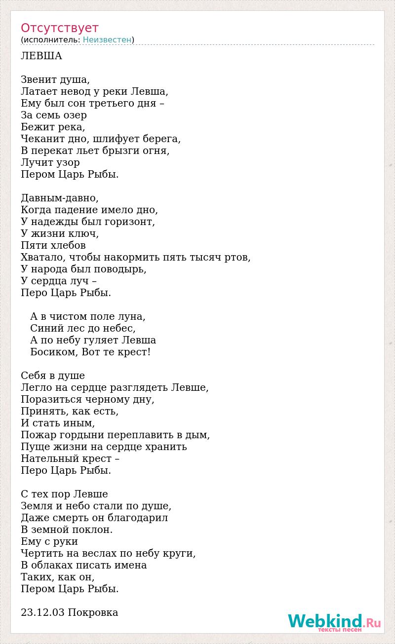 ЛЕВША Звенит душа, Латает невод у реки Левша, Ему был сон третьего дня – За семь озер Бежит река, Чеканит дно, шлифует берега, В перекат льет брызги огня, Лучит узор Пером Царь Рыбы. Давным-давно, Когда падение имело дно, У надежды был горизонт, У жизни ключ, Пяти хлебов Хватало, чтобы накормить пять тысяч ртов, У народа был поводырь, У сердца луч – Перо Царь Рыбы. А в чистом поле луна, Синий лес до небес, А по небу гуляет Левша Босиком, Вот те крест! Себя в душе Легло на сердце разглядеть Левше, Поразиться черному дну, Принять, как есть, И стать иным, Пожар гордыни переплавить в дым, Пуще жизни на сердце хранить Нательный крест – Перо Царь Рыбы. С тех пор Левше Земля и небо стали по душе, Даже смерть он благодарил В земной поклон. Ему с руки Чертить на веслах по небу круги, В облаках писать имена Таких, как он, Пером Царь Рыбы. 23.12.03 Покровка