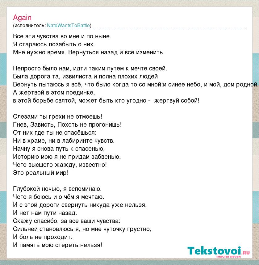 Все эти чувства во мне и по ныне. Я стараюсь позабыть о них. Мне нужно время. Вернуться назад и всё изменить. Непросто было нам, идти таким путем к мечте своей. Была дорога та, извилиста и полна плохих людей Вернуть пытаюсь я всё, что было когда то со мной:и синее небо, и мой, дом родной. А жертвой в этом поединке, в этой борьбе святой, может быть кто угодно - жертвуй собой! Слезами ты грехи не отмоешь! Гнев, Зависть, Похоть не прогонишь! От них где ты не спасёшься: Ни в храме, ни в лабиринте чувств. Начну я снова путь к спасенью, Историю мою я не придам забвенью. Чего высшего жажду, известно! Это реальный мир! Глубокой ночью, я вспоминаю. Чего я боюсь и о чём я мечтаю. И с этой дороги свернуть никуда уже нельзя, И нет нам пути назад. Скажу спасибо, за все ваши чувства: Сильней становлюсь я, но мне чуточку грустно, И боль не проходит. И память мою стереть нельзя!
