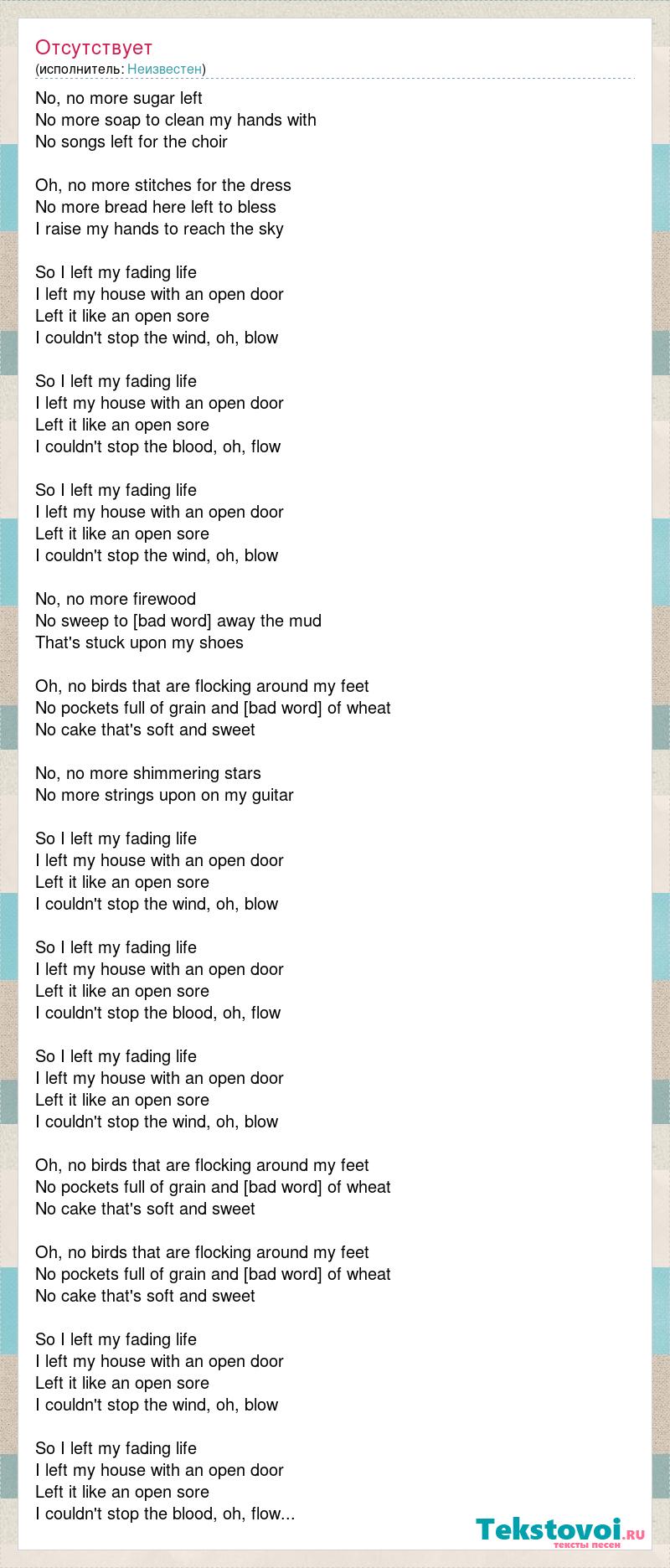 No, no more sugar left No more soap to clean my hands with No songs left for the choir Oh, no more stitches for the dress No more bread here left to bless I raise my hands to reach the sky So I left my fading life I left my house with an open door Left it like an open sore I couldn't stop the wind, oh, blow So I left my fading life I left my house with an open door Left it like an open sore I couldn't stop the blood, oh, flow So I left my fading life I left my house with an open door Left it like an open sore I couldn't stop the wind, oh, blow No, no more firewood No sweep to [bad word] away the mud That's stuck upon my shoes Oh, no birds that are flocking around my feet No pockets full of grain and [bad word] of wheat No cake that's soft and sweet No, no more shimmering stars No more strings upon on my guitar So I left my fading life I left my house with an open door Left it like an open sore I couldn't stop the wind, oh, blow So I left my fading life I left my house with an open door Left it like an open sore I couldn't stop the blood, oh, flow So I left my fading life I left my house with an open door Left it like an open sore I couldn't stop the wind, oh, blow Oh, no birds that are flocking around my feet No pockets full of grain and [bad word] of wheat No cake that's soft and sweet Oh, no birds that are flocking around my feet No pockets full of grain and [bad word] of wheat No cake that's soft and sweet So I left my fading life I left my house with an open door Left it like an open sore I couldn't stop the wind, oh, blow So I left my fading life I left my house with an open door Left it like an open sore I couldn't stop the blood, oh, flow...