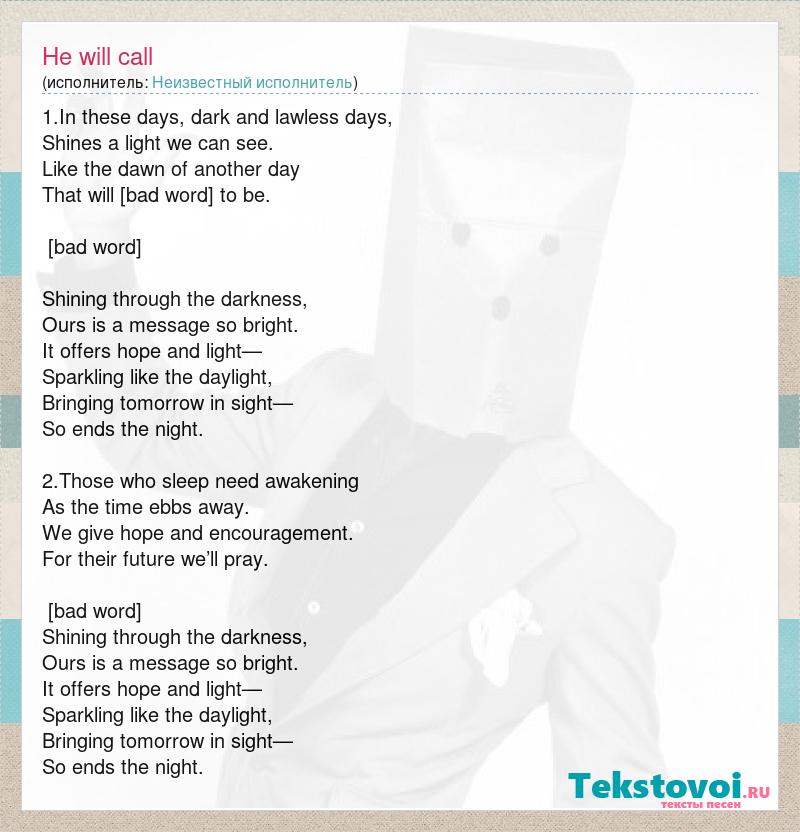 1.In these days, dark and lawless days, Shines a light we can see. Like the dawn of another day That will [bad word] to be. [bad word] Shining through the darkness, Ours is a message so bright. It offers hope and light— Sparkling like the daylight, Bringing tomorrow in sight— So ends the night. 2.Those who sleep need awakening As the time ebbs away. We give hope and encouragement. For their future we’ll pray. [bad word] Shining through the darkness, Ours is a message so bright. It offers hope and light— Sparkling like the daylight, Bringing tomorrow in sight— So ends the night.