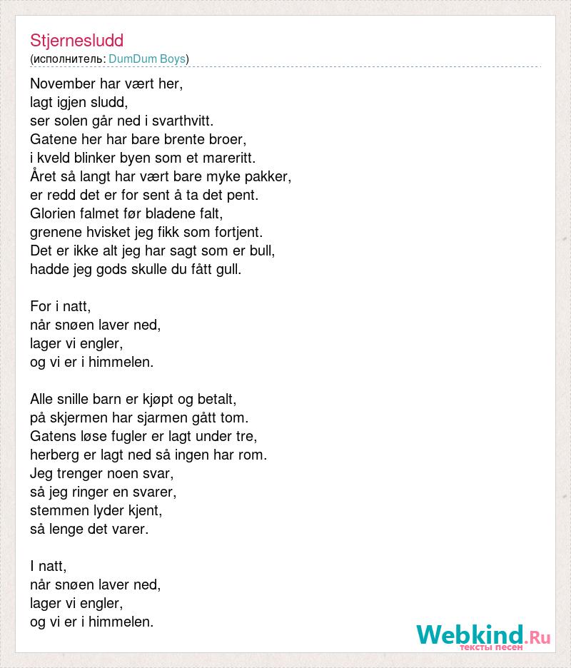 November har vært her, lagt igjen sludd, ser solen går ned i svarthvitt. Gatene her har bare brente broer, i kveld blinker byen som et mareritt. Året så langt har vært bare myke pakker, er redd det er for sent å ta det pent. Glorien falmet før bladene falt, grenene hvisket jeg fikk som fortjent. Det er ikke alt jeg har sagt som er bull, hadde jeg gods skulle du fått gull. For i natt, når snøen laver ned, lager vi engler, og vi er i himmelen. Alle snille barn er kjøpt og betalt, på skjermen har sjarmen gått tom. Gatens løse fugler er lagt under tre, herberg er lagt ned så ingen har rom. Jeg trenger noen svar, så jeg ringer en svarer, stemmen lyder kjent, så lenge det varer. I natt, når snøen laver ned, lager vi engler, og vi er i himmelen.