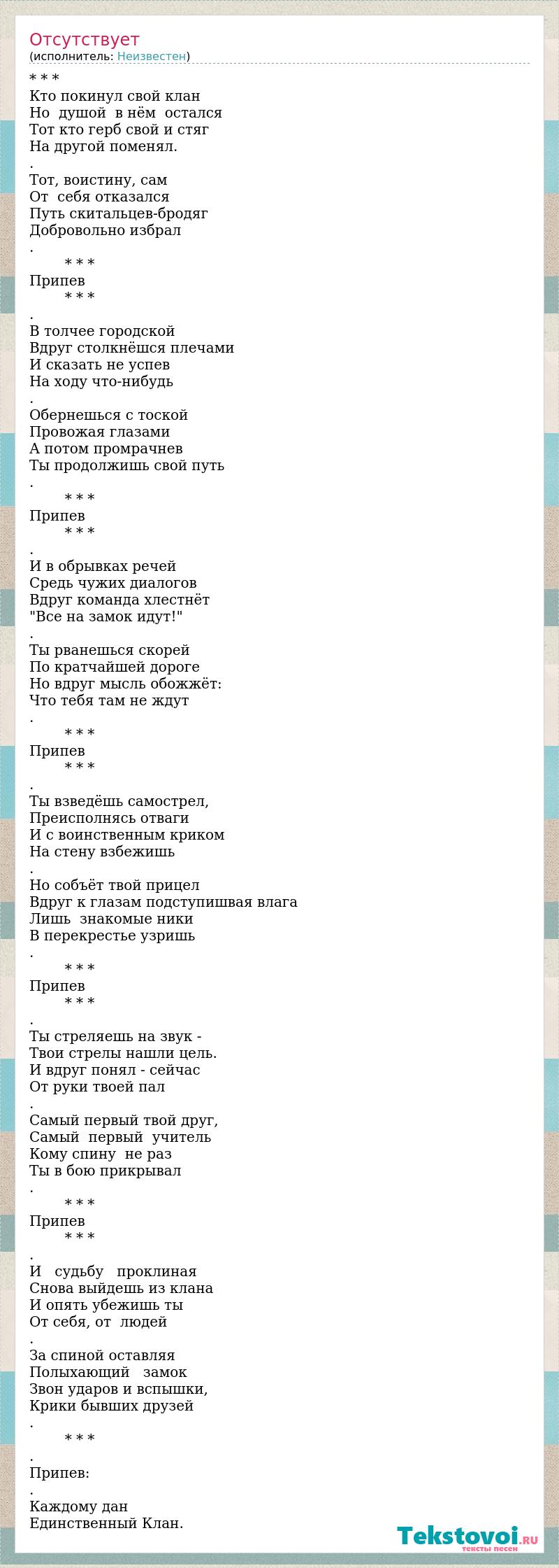 * * * Кто покинул свой клан Но душой в нём остался Тот кто герб свой и стяг На другой поменял. . Тот, воистину, сам От себя отказался Путь скитальцев-бродяг Добровольно избрал . * * * Припев * * * . В толчее городской Вдруг столкнёшся плечами И сказать не успев На ходу что-нибудь . Обернешься с тоской Провожая глазами А потом промрачнев Ты продолжишь свой путь . * * * Припев * * * . И в обрывках речей Средь чужих диалогов Вдруг команда хлестнёт "Все на замок идут!" . Ты рванешься скорей По кратчайшей дороге Но вдруг мысль обожжёт: Что тебя там не ждут . * * * Припев * * * . Ты взведёшь самострел, Преисполнясь отваги И с воинственным криком На стену взбежишь . Но собъёт твой прицел Вдруг к глазам подступишвая влага Лишь знакомые ники В перекрестье узришь . * * * Припев * * * . Ты стреляешь на звук - Твои стрелы нашли цель. И вдруг понял - сейчас От руки твоей пал . Самый первый твой друг, Самый первый учитель Кому спину не раз Ты в бою прикрывал . * * * Припев * * * . И судьбу проклиная Снова выйдешь из клана И опять убежишь ты От себя, от людей . За спиной оставляя Полыхающий замок Звон ударов и вспышки, Крики бывших друзей . * * * . Припев: . Каждому дан Единственный Клан.