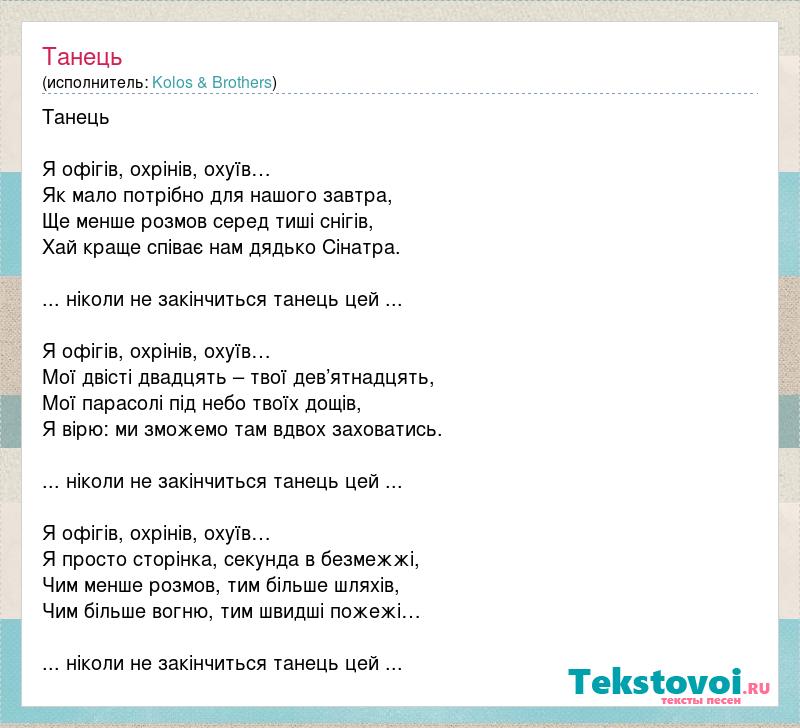 Танець Я офігів, охрінів, охуїв… Як мало потрібно для нашого завтра, Ще менше розмов серед тиші снігів, Хай краще співає нам дядько Сінатра. ... ніколи не закінчиться танець цей ... Я офігів, охрінів, охуїв… Мої двісті двадцять – твої дев’ятнадцять, Мої парасолі під небо твоїх дощів, Я вірю: ми зможемо там вдвох заховатись. ... ніколи не закінчиться танець цей ... Я офігів, охрінів, охуїв… Я просто сторінка, секунда в безмежжі, Чим менше розмов, тим більше шляхів, Чим більше вогню, тим швидші пожежі… ... ніколи не закінчиться танець цей ...