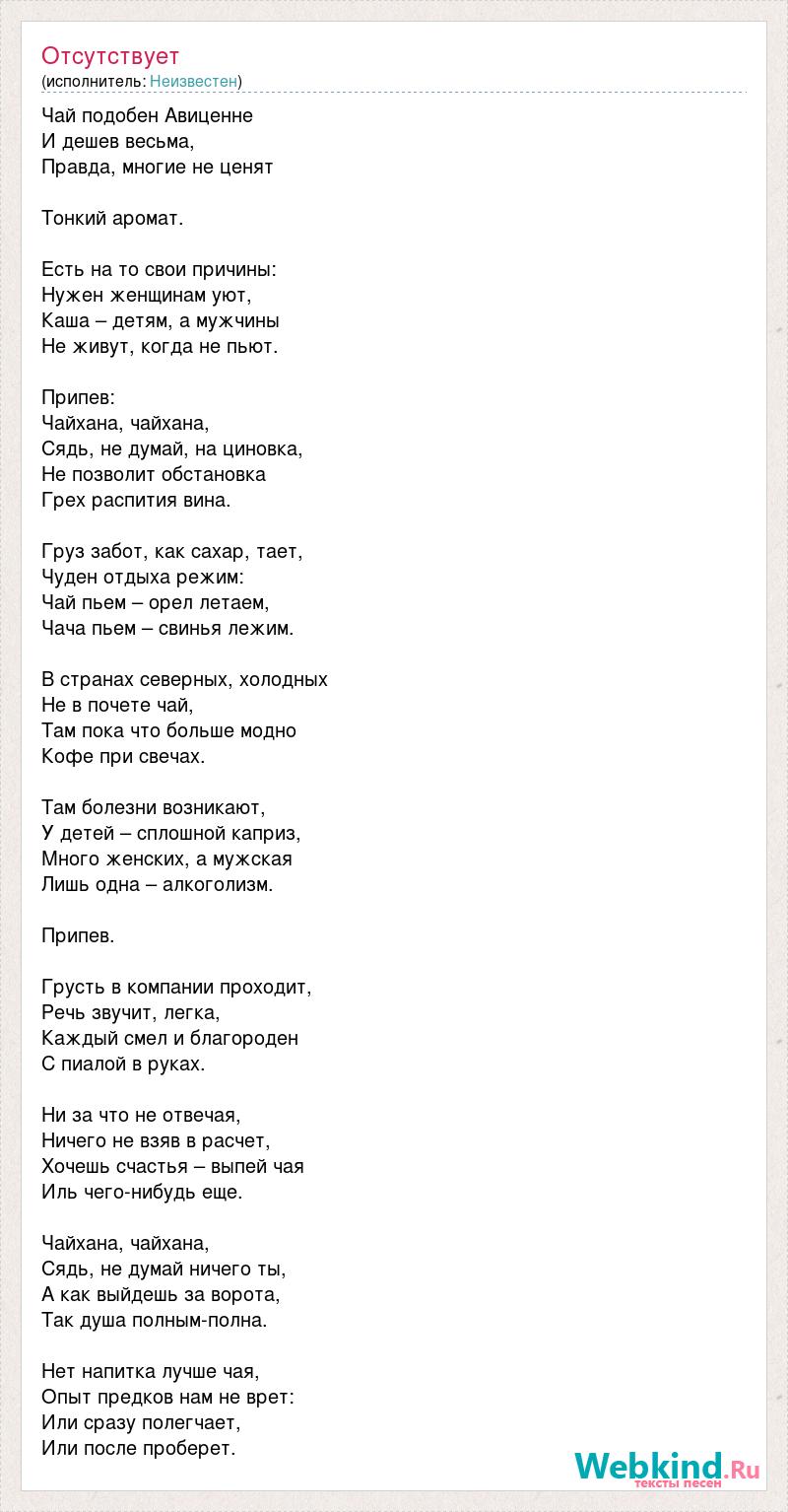 Чай подобен Авиценне И дешев весьма, Правда, многие не ценят Тонкий аромат. Есть на то свои причины: Нужен женщинам уют, Каша – детям, а мужчины Не живут, когда не пьют. Припев: Чайхана, чайхана, Сядь, не думай, на циновка, Не позволит обстановка Грех распития вина. Груз забот, как сахар, тает, Чуден отдыха режим: Чай пьем – орел летаем, Чача пьем – свинья лежим. В странах северных, холодных Не в почете чай, Там пока что больше модно Кофе при свечах. Там болезни возникают, У детей – сплошной каприз, Много женских, а мужская Лишь одна – алкоголизм. Припев. Грусть в компании проходит, Речь звучит, легка, Каждый смел и благороден С пиалой в руках. Ни за что не отвечая, Ничего не взяв в расчет, Хочешь счастья – выпей чая Иль чего-нибудь еще. Чайхана, чайхана, Сядь, не думай ничего ты, А как выйдешь за ворота, Так душа полным-полна. Нет напитка лучше чая, Опыт предков нам не врет: Или сразу полегчает, Или после проберет.