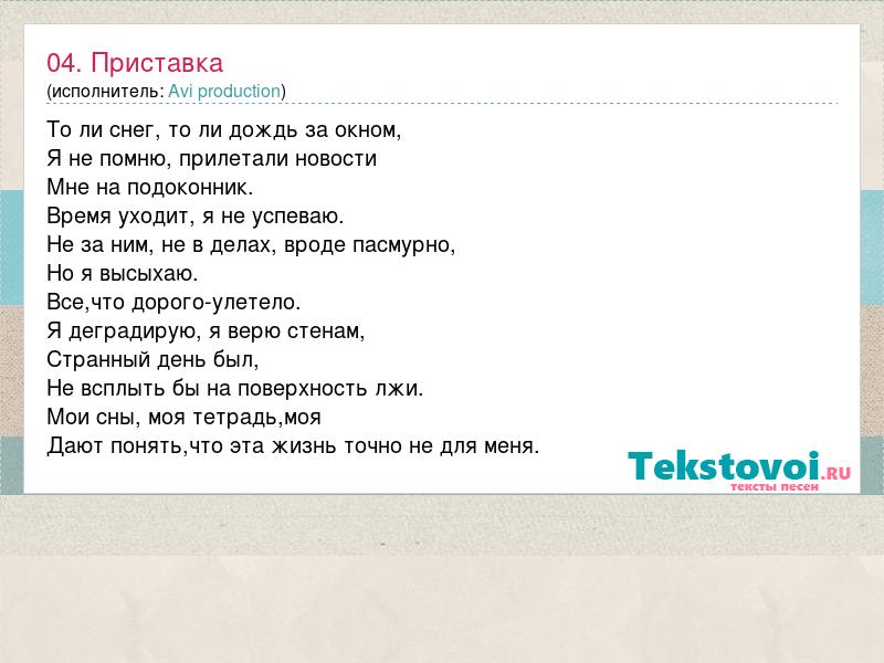 То ли снег, то ли дождь за окном, Я не помню, прилетали новости Мне на подоконник. Время уходит, я не успеваю. Не за ним, не в делах, вроде пасмурно, Но я высыхаю. Все,что дорого-улетело. Я деградирую, я верю стенам, Странный день был, Не всплыть бы на поверхность лжи. Мои сны, моя тетрадь,моя Дают понять,что эта жизнь точно не для меня.