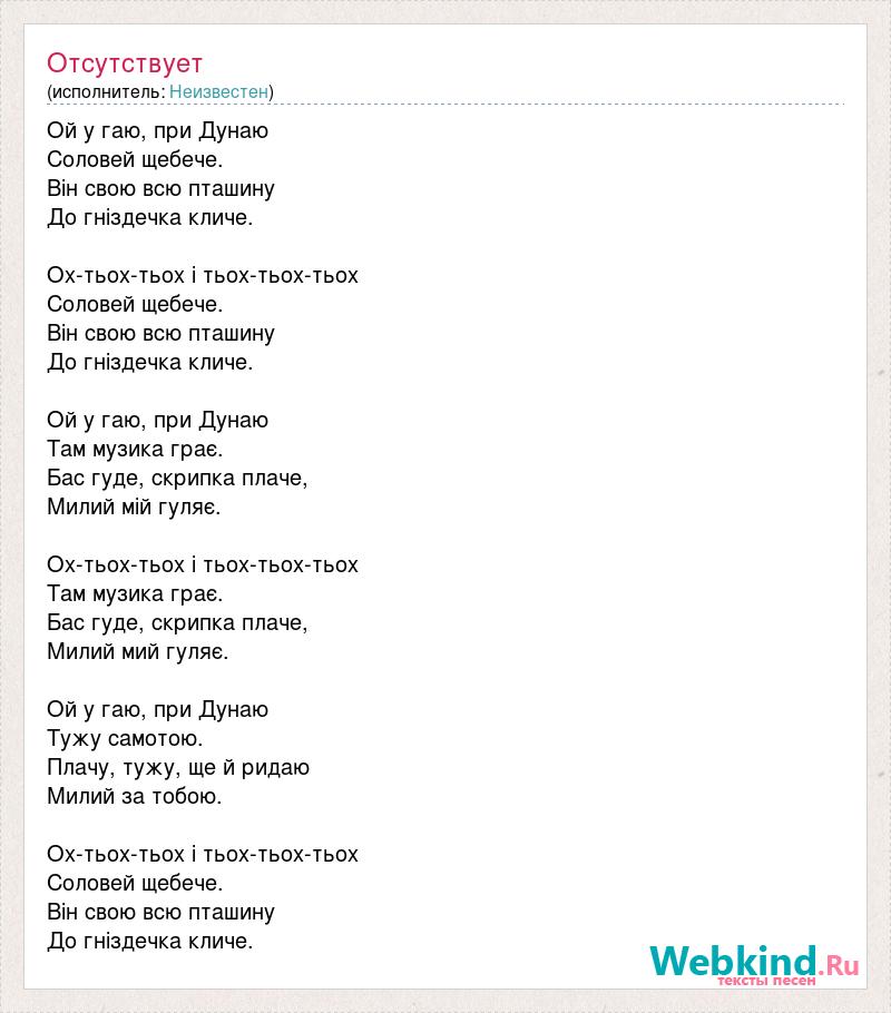 Ой у гаю, при Дунаю Соловей щебече. Він свою всю пташину До гніздечка кличе. Ох-тьох-тьох і тьох-тьох-тьох Соловей щебече. Він свою всю пташину До гніздечка кличе. Ой у гаю, при Дунаю Там музика грає. Бас гуде, скрипка плаче, Милий мій гуляє. Ох-тьох-тьох і тьох-тьох-тьох Там музика грає. Бас гуде, скрипка плаче, Милий мий гуляє. Ой у гаю, при Дунаю Тужу самотою. Плачу, тужу, ще й ридаю Милий за тобою. Ох-тьох-тьох і тьох-тьох-тьох Соловей щебече. Він свою всю пташину До гніздечка кличе.