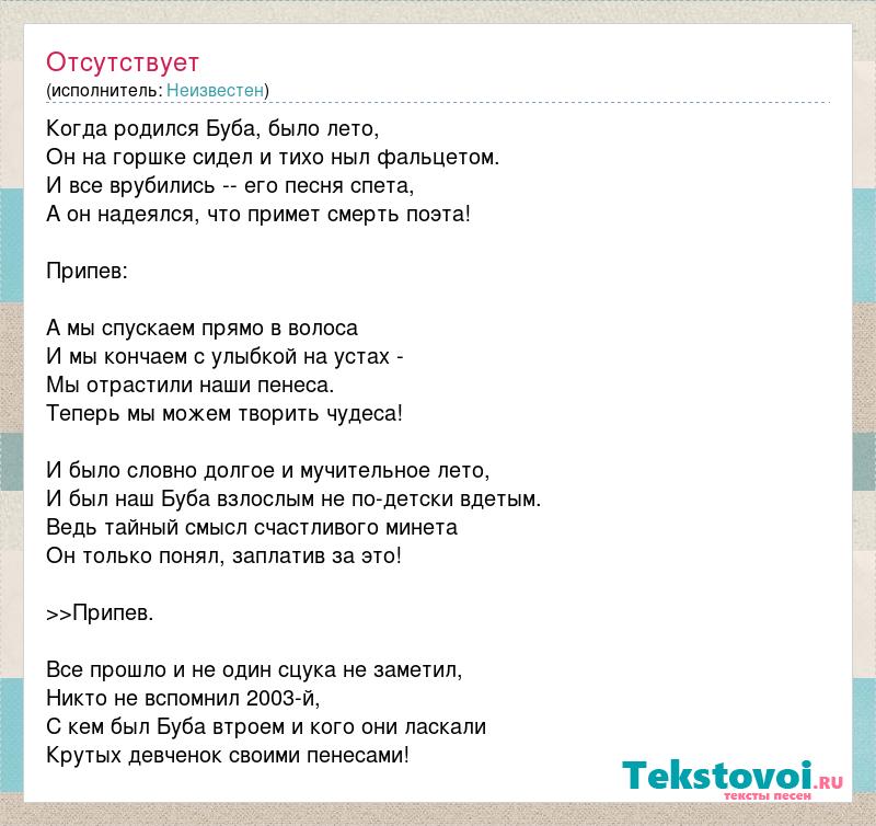 Когда родился Буба, было лето, Он на горшке сидел и тихо ныл фальцетом. И все врубились -- его песня спета, А он надеялся, что примет смерть поэта! Припев: А мы спускаем прямо в волоса И мы кончаем с улыбкой на устах - Мы отрастили наши пенеса. Теперь мы можем творить чудеса! И было словно долгое и мучительное лето, И был наш Буба взлослым не по-детски вдетым. Ведь тайный смысл счастливого минета Он только понял, заплатив за это! >>Припев. Все прошло и не один сцука не заметил, Никто не вспомнил 2003-й, С кем был Буба втроем и кого они ласкали Крутых девченок своими пенесами!