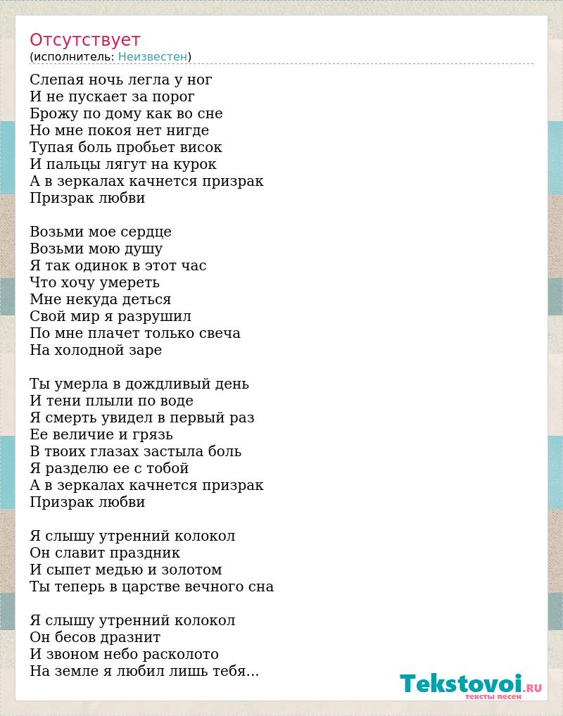 Слепая ночь легла у ног И не пускает за порог Брожу по дому как во сне Но мне покоя нет нигде Тупая боль пробьет висок И пальцы лягут на курок А в зеркалах качнется призрак Призрак любви Возьми мое сердце Возьми мою душу Я так одинок в этот час Что хочу умереть Мне некуда деться Свой мир я разрушил По мне плачет только свеча На холодной заре Ты умерла в дождливый день И тени плыли по воде Я смерть увидел в первый раз Ее величие и грязь В твоих глазах застыла боль Я разделю ее с тобой А в зеркалах качнется призрак Призрак любви Я слышу утренний колокол Он славит праздник И сыпет медью и золотом Ты теперь в царстве вечного сна Я слышу утренний колокол Он бесов дразнит И звоном небо расколото На земле я любил лишь тебя...