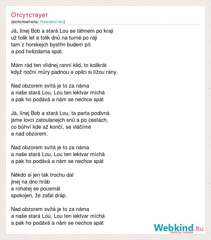 Já, línej Bob a stará Lou se táhnem po kraji už tolik let a tolik dnů na turné po ráji tam z horskejch bystřin budem pít a pod hvězdama spát. Mám rád ten vlídnej ranní klid, to kolikrát když noční můry padnou a opilci si lížou rány. Nad obzorem svítá je to za náma a naše stará Lou, Lou ten lektvar míchá a pak ho podává a nám se nechce spát Já, línej Bob a stará Lou, ta parta podivná jsme lovci zatoulanejch snů a po cestách, co bůhví kde až končí, se vláčíme a nad obzorem. Nad obzorem svítá je to za náma a naše stará Lou, Lou ten lektvar míchá a pak ho podává a nám se nechce spát Někdo si jen tak trochu dal jinej na dno hráb a rohatej se pousmál spokojen, že zaťal dráp. Nad obzorem svítá je to za náma a naše stará Lou, Lou ten lektvar míchá a pak ho podává a nám se nechce spát