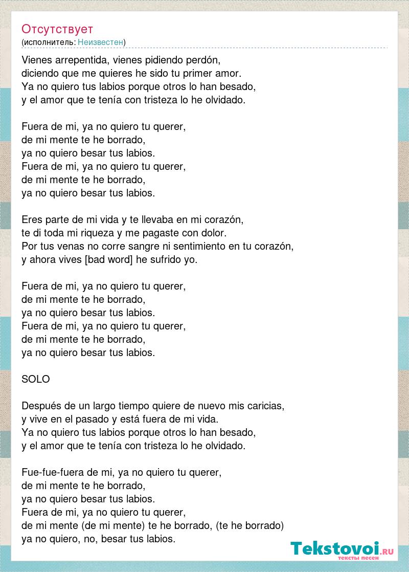 Vienes arrepentida, vienes pidiendo perdón, diciendo que me quieres he sido tu primer amor. Ya no quiero tus labios porque otros lo han besado, y el amor que te tenía con tristeza lo he olvidado. Fuera de mi, ya no quiero tu querer, de mi mente te he borrado, ya no quiero besar tus labios. Fuera de mi, ya no quiero tu querer, de mi mente te he borrado, ya no quiero besar tus labios. Eres parte de mi vida y te llevaba en mi corazón, te di toda mi riqueza y me pagaste con dolor. Por tus venas no corre sangre ni sentimiento en tu corazón, y ahora vives [bad word] he sufrido yo. Fuera de mi, ya no quiero tu querer, de mi mente te he borrado, ya no quiero besar tus labios. Fuera de mi, ya no quiero tu querer, de mi mente te he borrado, ya no quiero besar tus labios. SOLO Después de un largo tiempo quiere de nuevo mis caricias, y vive en el pasado y está fuera de mi vida. Ya no quiero tus labios porque otros lo han besado, y el amor que te tenía con tristeza lo he olvidado. Fue-fue-fuera de mi, ya no quiero tu querer, de mi mente te he borrado, ya no quiero besar tus labios. Fuera de mi, ya no quiero tu querer, de mi mente (de mi mente) te he borrado, (te he borrado) ya no quiero, no, besar tus labios.