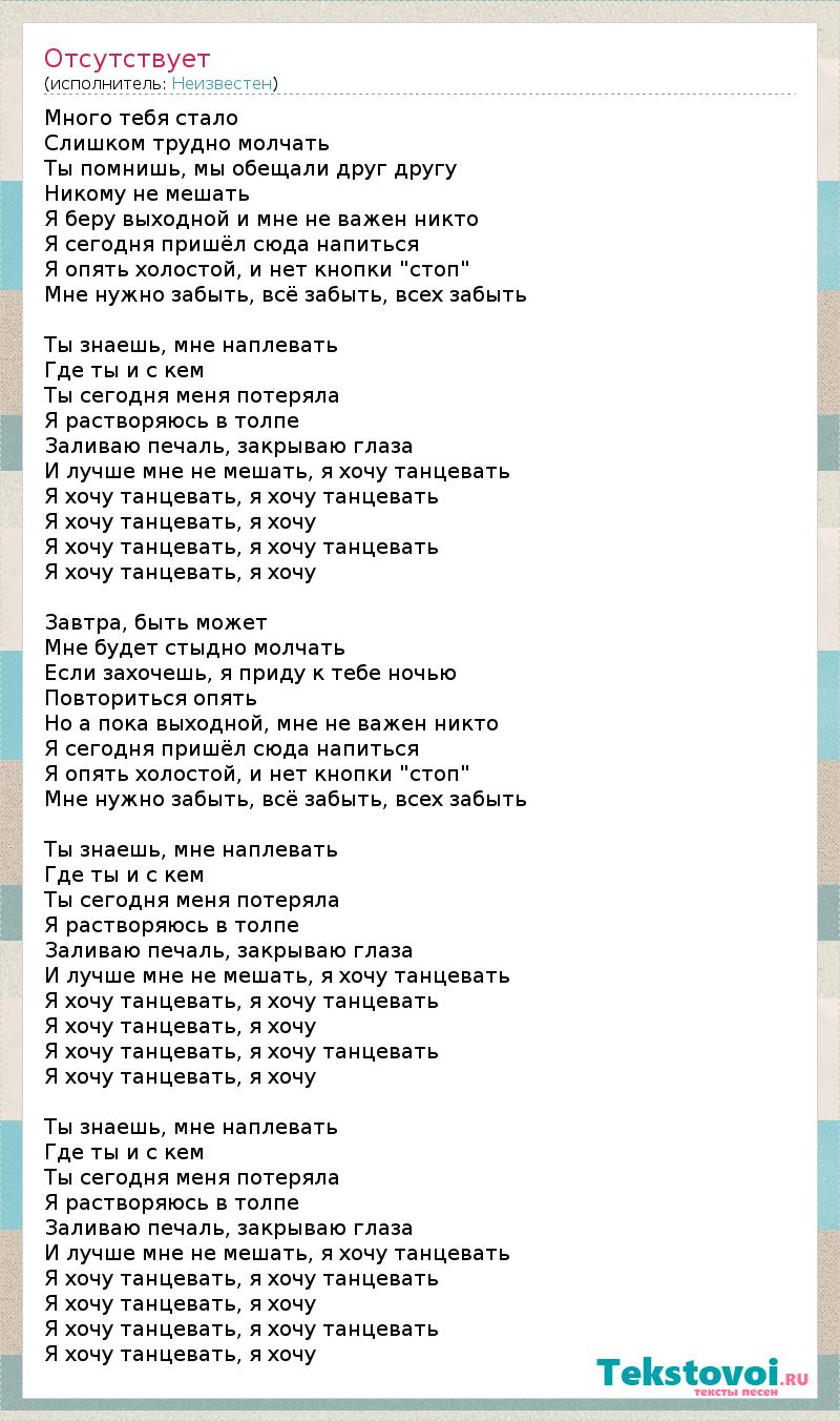 Много тебя стало Слишком трудно молчать Ты помнишь, мы обещали друг другу Никому не мешать Я беру выходной и мне не важен никто Я сегодня пришёл сюда напиться Я опять холостой, и нет кнопки "стоп" Мне нужно забыть, всё забыть, всех забыть Ты знаешь, мне наплевать Где ты и с кем Ты сегодня меня потеряла Я растворяюсь в толпе Заливаю печаль, закрываю глаза И лучше мне не мешать, я хочу танцевать Я хочу танцевать, я хочу танцевать Я хочу танцевать, я хочу Я хочу танцевать, я хочу танцевать Я хочу танцевать, я хочу Завтра, быть может Мне будет стыдно молчать Если захочешь, я приду к тебе ночью Повториться опять Но а пока выходной, мне не важен никто Я сегодня пришёл сюда напиться Я опять холостой, и нет кнопки "стоп" Мне нужно забыть, всё забыть, всех забыть Ты знаешь, мне наплевать Где ты и с кем Ты сегодня меня потеряла Я растворяюсь в толпе Заливаю печаль, закрываю глаза И лучше мне не мешать, я хочу танцевать Я хочу танцевать, я хочу танцевать Я хочу танцевать, я хочу Я хочу танцевать, я хочу танцевать Я хочу танцевать, я хочу Ты знаешь, мне наплевать Где ты и с кем Ты сегодня меня потеряла Я растворяюсь в толпе Заливаю печаль, закрываю глаза И лучше мне не мешать, я хочу танцевать Я хочу танцевать, я хочу танцевать Я хочу танцевать, я хочу Я хочу танцевать, я хочу танцевать Я хочу танцевать, я хочу