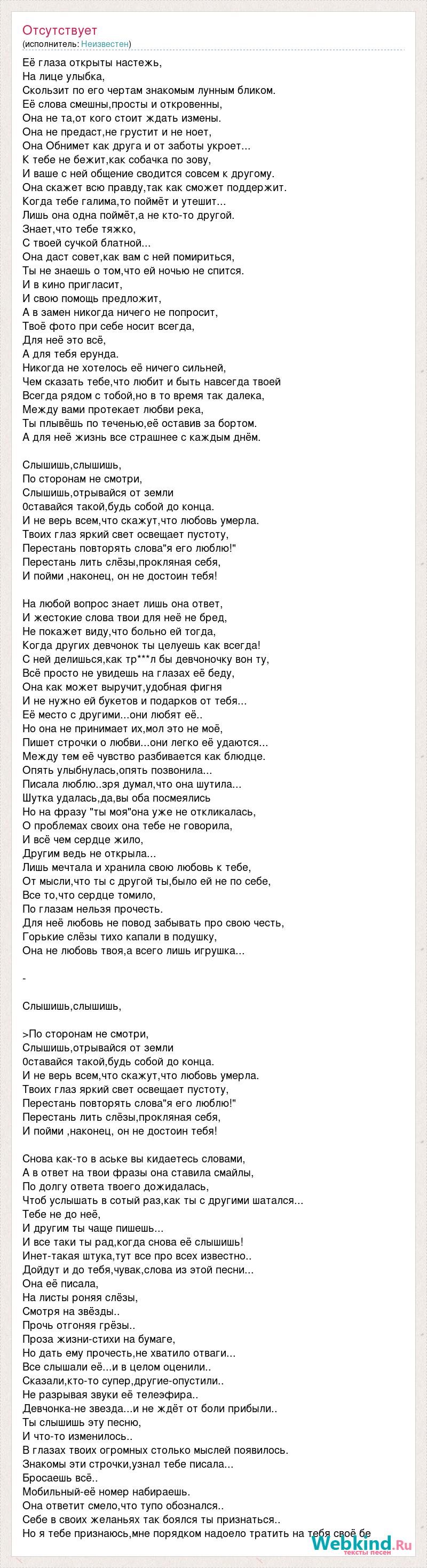 Её глаза открыты настежь, На лице улыбка, Скользит по его чертам знакомым лунным бликом. Её слова смешны,просты и откровенны, Она не та,от кого стоит ждать измены. Она не предаст,не грустит и не ноет, Она Обнимет как друга и от заботы укроет... К тебе не бежит,как собачка по зову, И ваше с ней общение сводится совсем к другому. Она скажет всю правду,так как сможет поддержит. Когда тебе галима,то поймёт и утешит... Лишь она одна поймёт,а не кто-то другой. Знает,что тебе тяжко, С твоей сучкой блатной... Она даст совет,как вам с ней помириться, Ты не знаешь о том,что ей ночью не спится. И в кино пригласит, И свою помощь предложит, А в замен никогда ничего не попросит, Твоё фото при себе носит всегда, Для неё это всё, А для тебя ерунда. Никогда не хотелось её ничего сильней, Чем сказать тебе,что любит и быть навсегда твоей Всегда рядом с тобой,но в то время так далека, Между вами протекает любви река, Ты плывёшь по теченью,её оставив за бортом. А для неё жизнь все страшнее с каждым днём. Слышишь,слышишь, По сторонам не смотри, Слышишь,отрывайся от земли 0ставайся такой,будь собой до конца. И не верь всем,что скажут,что любовь умерла. Твоих глаз яркий свет освещает пустоту, Перестань повторять слова"я его люблю!" Перестань лить слёзы,прокляная себя, И пойми ,наконец, он не достоин тебя! На любой вопрос знает лишь она ответ, И жестокие слова твои для неё не бред, Не покажет виду,что больно ей тогда, Когда других девчонок ты целуешь как всегда! С ней делишься,как тр***л бы девчоночку вон ту, Всё просто не увидешь на глазах её беду, Она как может выручит,удобная фигня И не нужно ей букетов и подарков от тебя... Её место с другими...они любят её.. Но она не принимает их,мол это не моё, Пишет строчки о любви...они легко её удаются... Между тем её чувство разбивается как блюдце. Опять улыбнулась,опять позвонила... Писала люблю..зря думал,что она шутила... Шутка удалась,да,вы оба посмеялись Но на фразу "ты моя"она уже не откликалась, О проблемах своих она тебе не говорила, И всё чем сердце жило, Другим ведь не открыла... Лишь мечтала и хранила свою любовь к тебе, От мысли,что ты с другой ты,было ей не по себе, Все то,что сердце томило, По глазам нельзя прочесть. Для неё любовь не повод забывать про свою честь, Горькие слёзы тихо капали в подушку, Она не любовь твоя,а всего лишь игрушка... - Слышишь,слышишь, >По сторонам не смотри, Слышишь,отрывайся от земли 0ставайся такой,будь собой до конца. И не верь всем,что скажут,что любовь умерла. Твоих глаз яркий свет освещает пустоту, Перестань повторять слова"я его люблю!" Перестань лить слёзы,прокляная себя, И пойми ,наконец, он не достоин тебя! Снова как-то в аське вы кидаетесь словами, А в ответ на твои фразы она ставила смайлы, По долгу ответа твоего дожидалась, Чтоб услышать в сотый раз,как ты с другими шатался... Тебе не до неё, И другим ты чаще пишешь... И все таки ты рад,когда снова её слышишь! Инет-такая штука,тут все про всех известно.. Дойдут и до тебя,чувак,слова из этой песни... Она её писала, На листы роняя слёзы, Смотря на звёзды.. Прочь отгоняя грёзы.. Проза жизни-стихи на бумаге, Но дать ему прочесть,не хватило отваги... Все слышали её...и в целом оценили.. Сказали,кто-то супер,другие-опустили.. Не разрывая звуки её телеэфира.. Девчонка-не звезда...и не ждёт от боли прибыли.. Ты слышишь эту песню, И что-то изменилось.. В глазах твоих огромных столько мыслей появилос