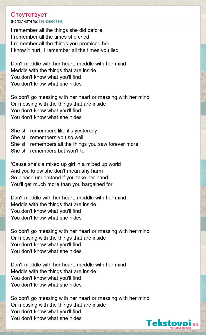 I remember all the things she did before I remember all the times she cried I remember all the things you promised her I know it hurt, I remember all the times you lied Don't meddle with her heart, meddle with her mind Meddle with the things that are inside You don't know what you'll find You don't know what she hides So don't go messing with her heart or messing with her mind Or messing with the things that are inside You don't know what you'll find You don't know what she hides She still remembers like it's yesterday She still remembers you so well She still remembers all the things you saw forever more She still remembers but won't tell 'Cause she's a mixed up girl in a mixed up world And you know she don't mean any harm So please understand if you take her hand You'll get much more than you bargained for Don't meddle with her heart, meddle with her mind Meddle with the things that are inside You don't know what you'll find You don't know what she hides So don't go messing with her heart or messing with her mind Or messing with the things that are inside You don't know what you'll find You don't know what she hides Don't meddle with her heart, meddle with her mind Meddle with the things that are inside You don't know what you'll find You don't know what she hides So don't go messing with her heart or messing with her mind Or messing with the things that are inside You don't know what you'll find You don't know what she hides