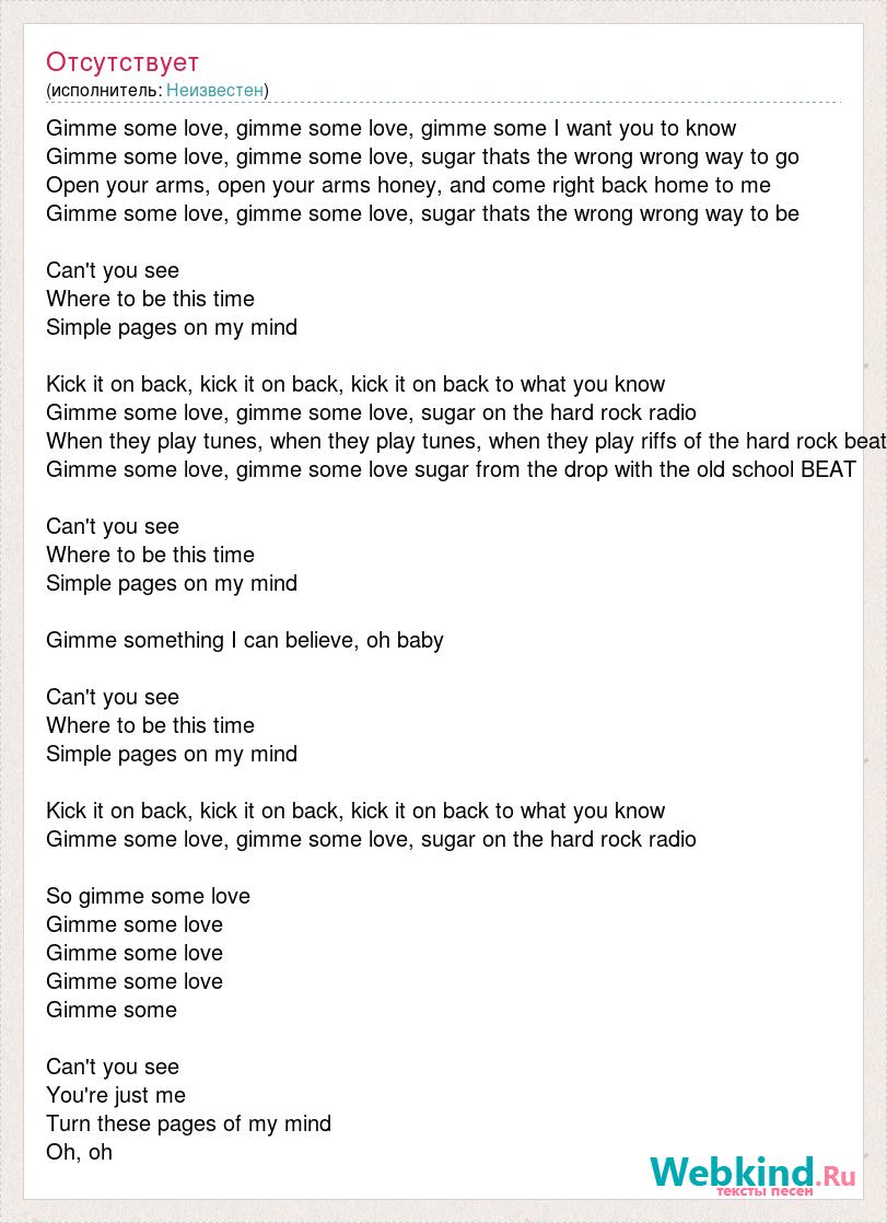 Gimme some love, gimme some love, gimme some I want you to know Gimme some love, gimme some love, sugar thats the wrong wrong way to go Open your arms, open your arms honey, [bad word] right back home to me Gimme some love, gimme some love, sugar thats the wrong wrong way to be Can't you see Where to be this time Simple pages on my mind Kick it on back, kick it on back, kick it on back to what you know Gimme some love, gimme some love, sugar on the hard rock radio When they play tunes, when they play tunes, when they play riffs of the hard rock beat Gimme some love, gimme some love sugar from the drop with the old school BEAT Can't you see Where to be this time Simple pages on my mind Gimme something I can believe, oh baby Can't you see Where to be this time Simple pages on my mind Kick it on back, kick it on back, kick it on back to what you know Gimme some love, gimme some love, sugar on the hard rock radio So gimme some love Gimme some love Gimme some love Gimme some love Gimme some Can't you see You're just me Turn these pages of my mind Oh, oh